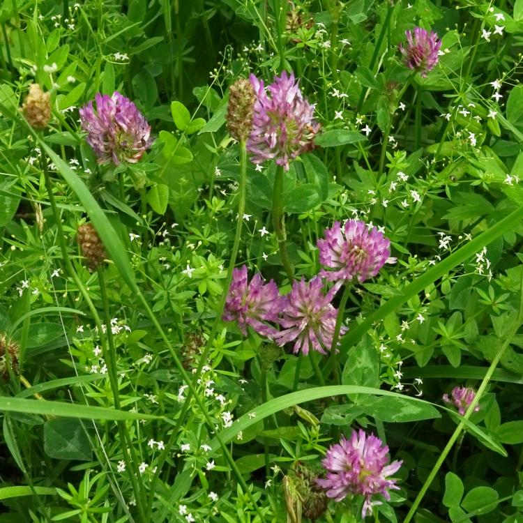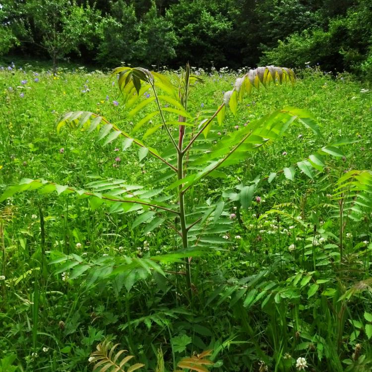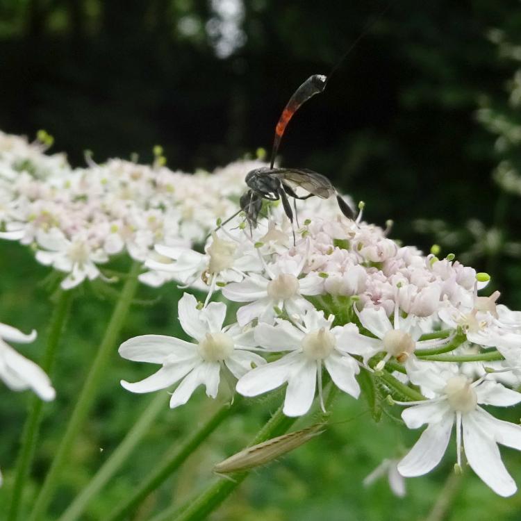 Auf der Musterfläche R5-Kleiner Sortengarten gibt es auf dem vielen Wiesen-Bärenklau unglaublich vielfältige Insekten: Die Dolden ziehen sowohl "normale" Fliegenarten an, aber auch wunderschöne Schwebfliegenarten wie die attraktive große Hornissen-Schwebfliege, ebenso die Totenkopf-Schwebfliege oder auch die schöne gelb-schwarze Chrysotoxum intermedium. So viele Schwebfliegenarten in so einer großen Anzahl insgesamt konnte ich noch nirgends beobachten! Ein schwarzes sehr merkwürdig aussehendes Insekt, das ich nicht wirklich bestimmen konnte mit einer Art "Ausleger", erst dicker, dann dünn wie eine lange Antenne war auch auf den Dolden mehrfach zu sehen. WAS IST DAS? Ist der "Ausleger" eine Art temporäres Legerohr - oder gehört dies dauerhaft zum Insekt?! Im rechten Teil der Wiese wachsen jetzt Sprösslinge von Essigbäumen hoch, diese vermehren sich unterirdisch dahin und sollten entfernt werden.