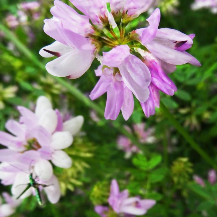 Der riesige Brombeerbusch ist in voller Blüte - ein wahres Eldorado für Bestäuber aller Art, die heute hier zu sehen sind: Rosenkäfer, ein schwarz-gesaumter Schmalbock, ein Ameisen-Sackkäfer, sehr viele Honigbienen und einzelne Fliegen. Ein weiterer Hotspot für Nektar und Pollen stellen die vielen Quadratmeter Kronwicken dar, die nicht nur sehr attraktiv aussehen, sondern viele Insekten anziehen: Einen Schachbrettfalter, einen Schenkelkäfer, ein Trauer-Rosenkäfer, Honigbienen und Hummeln. Hier braucht man sich einfach nur hinzustellen mit der Kamera und kurze Zeit warten - es stellen sich jede Menge Insekten ein.