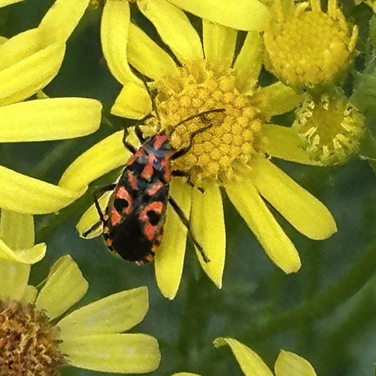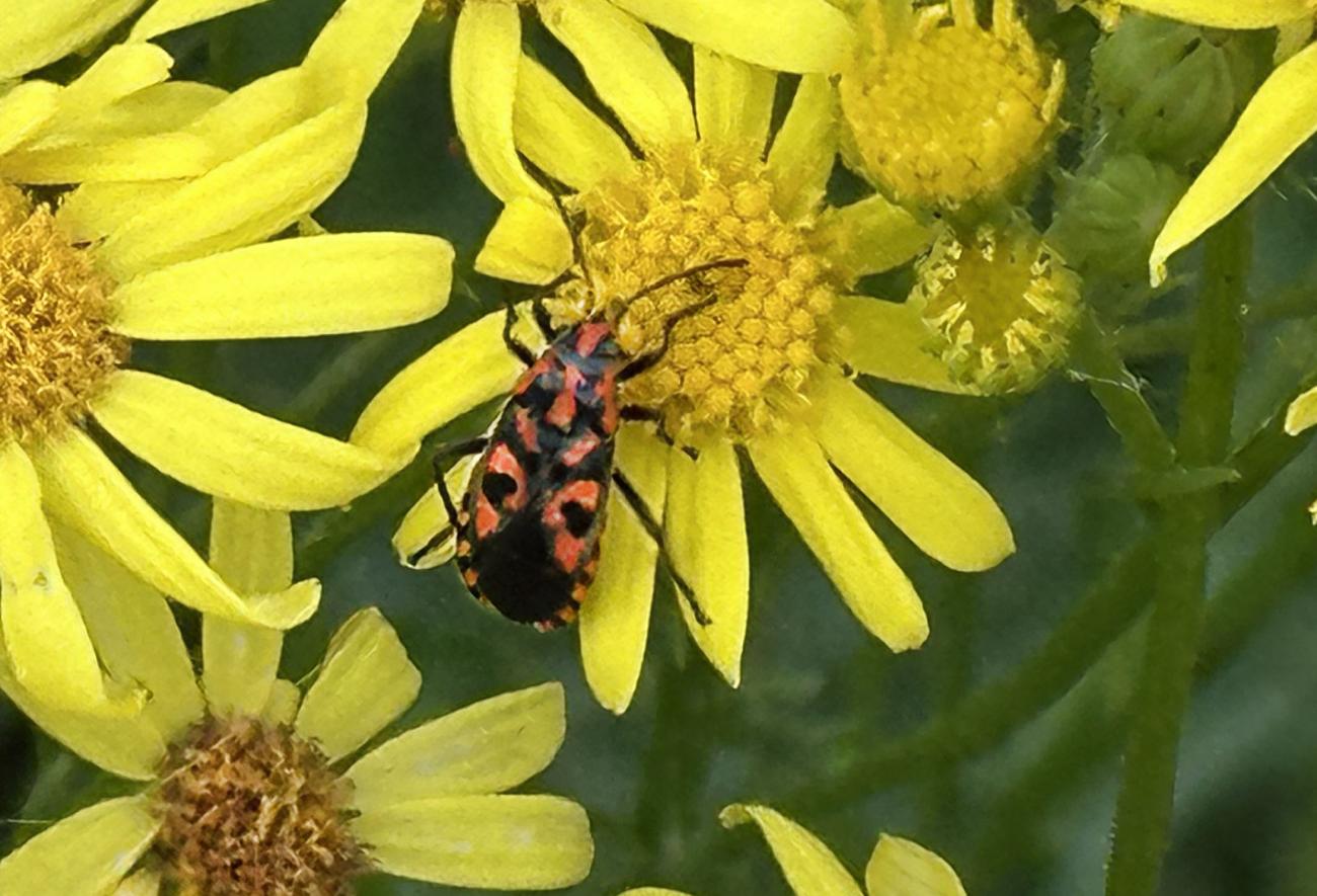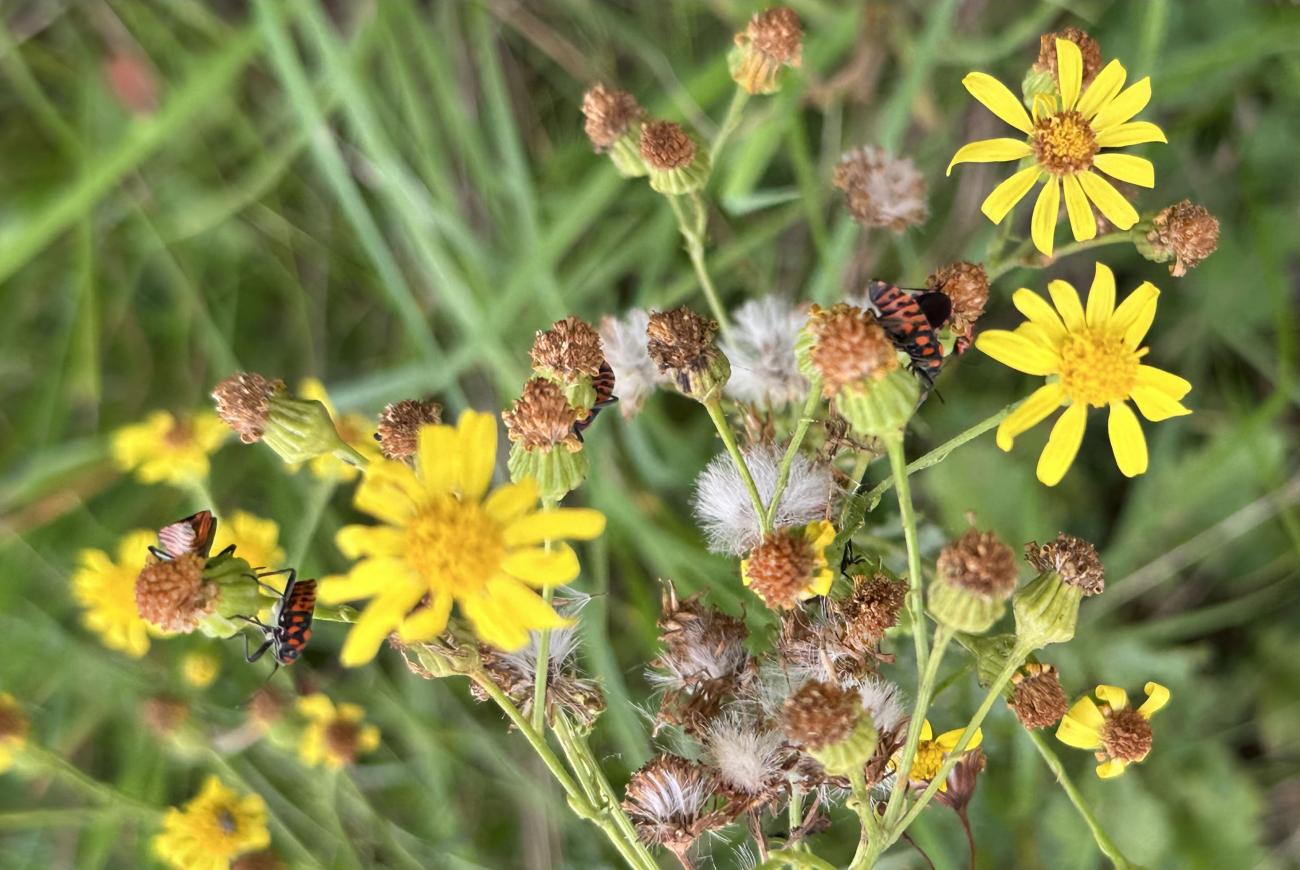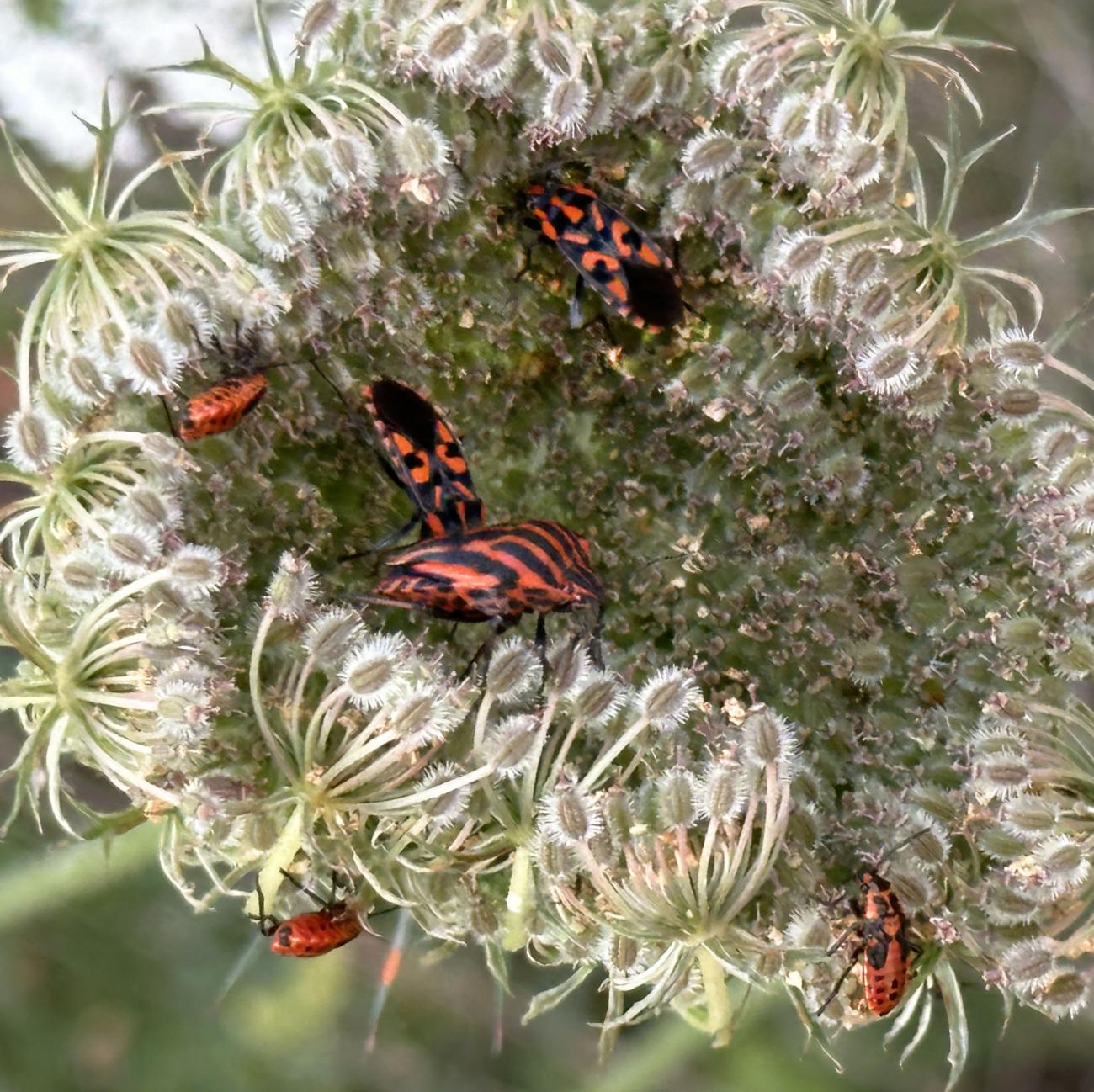 Es stehen noch einige Jakobs-Kreuzkräuter auf der Musterfläche. Wir lassen sie den Insekten, solange sie nicht beginnen sich zu versamen. Dann müssen sie weg. Das Highlight heute darauf war das scharz-weiße Ackerwinden-Bunteulchen (Acontia Trabealis). Vorher noch nie gesehen, sehr schön! Außerdem ist auf dem Jakobs-Kreuzkraut auch oft die Kinderstube der Knappen, auch Stein-Ritterwanze genannt zu sehen. Wie auch oft auf der Wilden Möhre. Auf einem Foto hier sind sowohl Knappen plus eine Streifenwanze zu sehen. Auf anderen Samenständen juvenile Feuerwanzen. bei schwindendem Licht noch einen Rotrandbär gesichtet (Foto unscharf). Ein Exemplar davon habe ich auch hier im letzten Jahr gesehen. Eine Kronwicke hat sich vom Nachbargrundstück (R7) jetzt hierher versamt.
