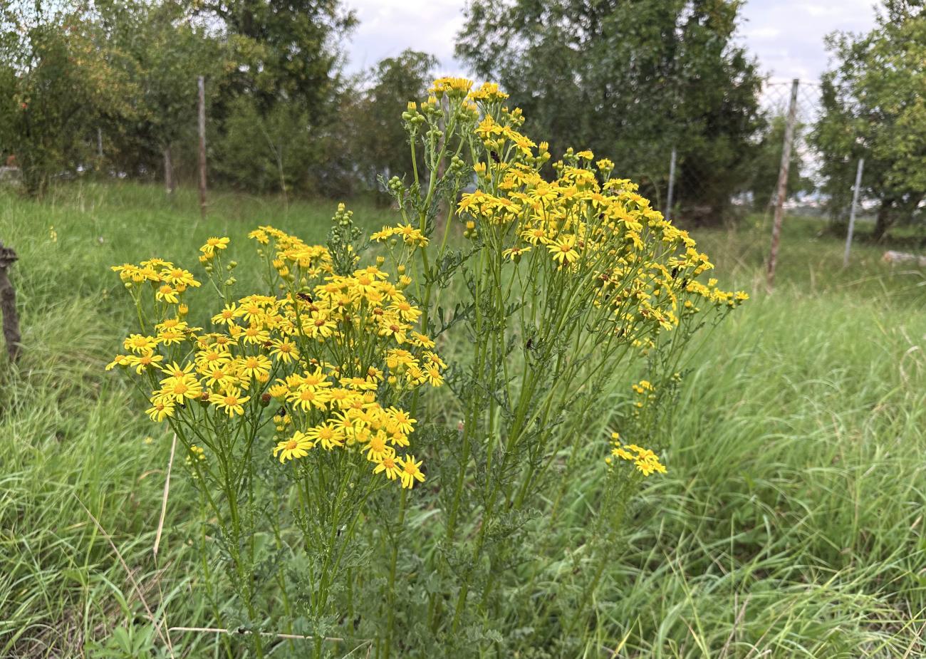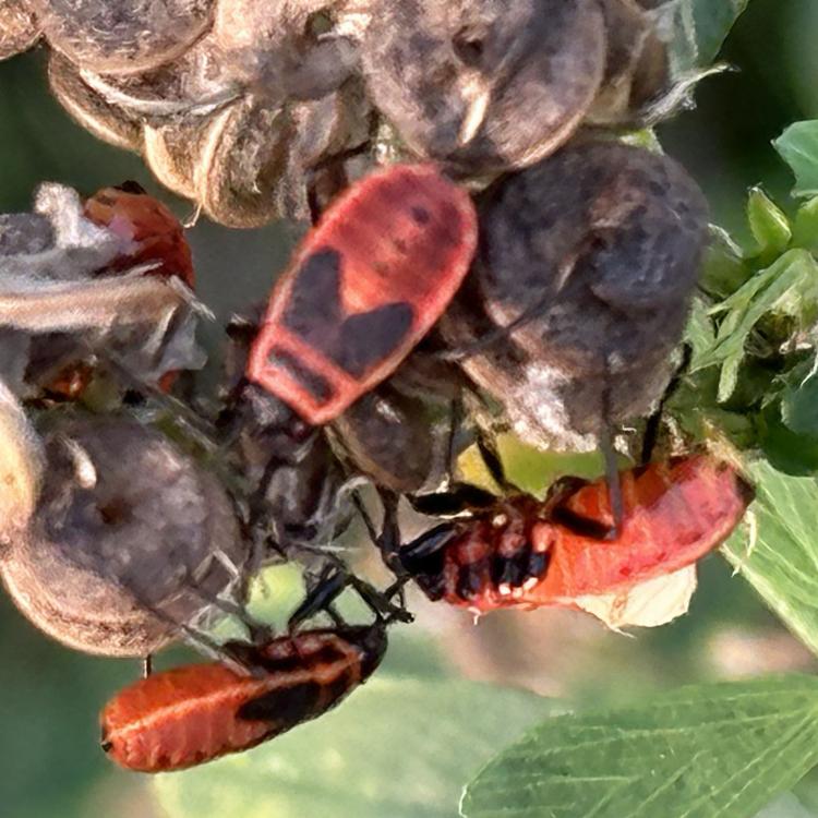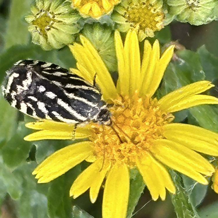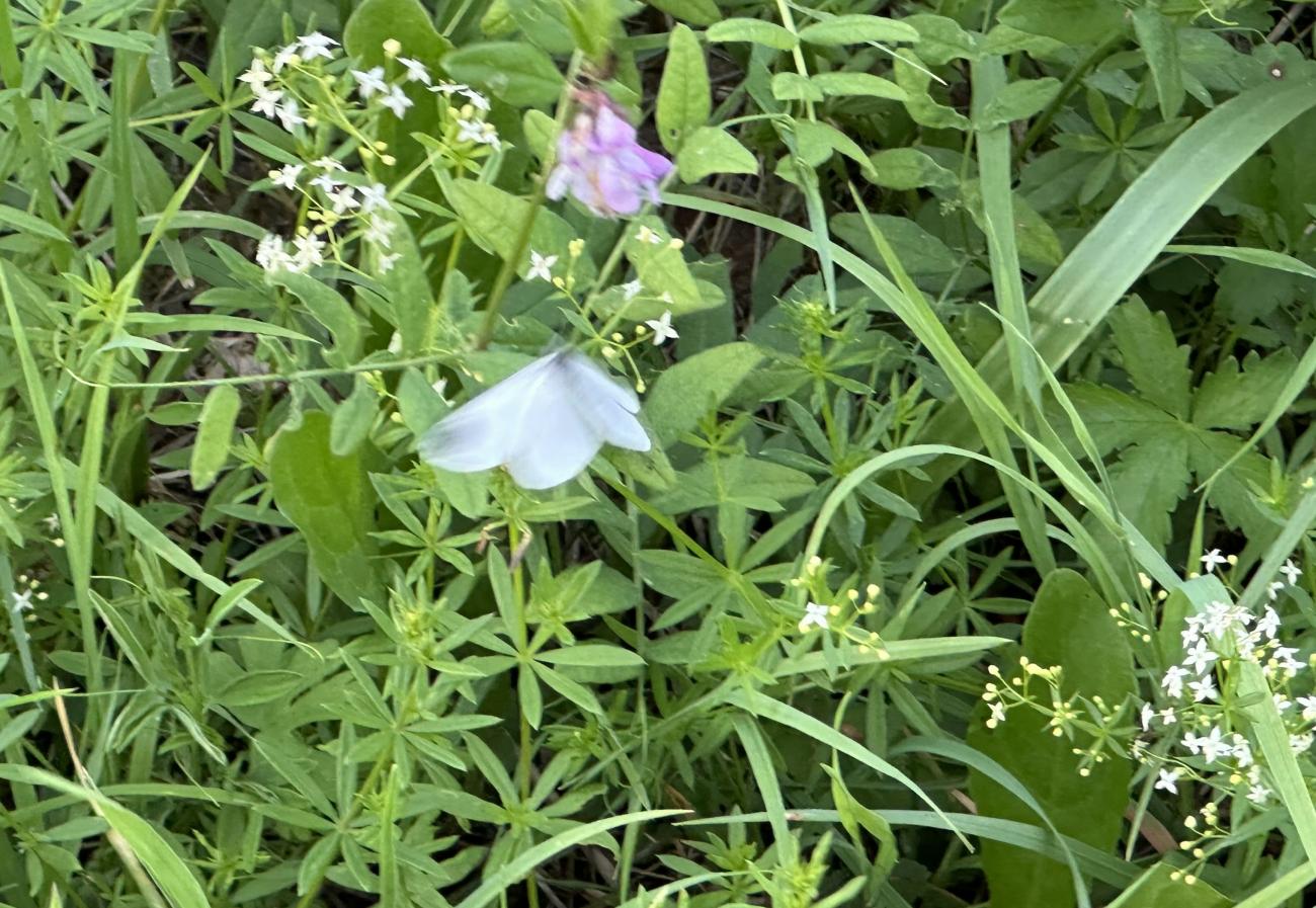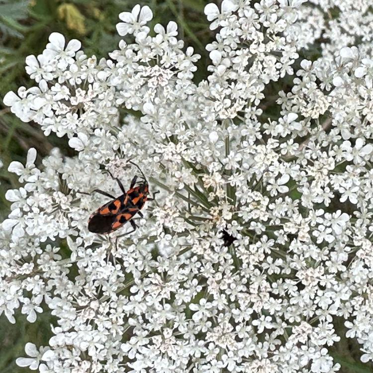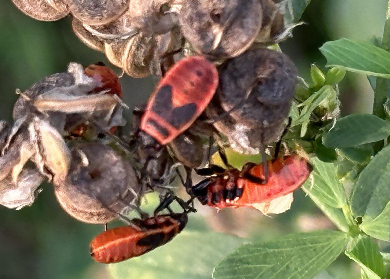 Es stehen noch einige Jakobs-Kreuzkräuter auf der Musterfläche. Wir lassen sie den Insekten, solange sie nicht beginnen sich zu versamen. Dann müssen sie weg. Das Highlight heute darauf war das scharz-weiße Ackerwinden-Bunteulchen (Acontia Trabealis). Vorher noch nie gesehen, sehr schön! Außerdem ist auf dem Jakobs-Kreuzkraut auch oft die Kinderstube der Knappen, auch Stein-Ritterwanze genannt zu sehen. Wie auch oft auf der Wilden Möhre. Auf einem Foto hier sind sowohl Knappen plus eine Streifenwanze zu sehen. Auf anderen Samenständen juvenile Feuerwanzen. bei schwindendem Licht noch einen Rotrandbär gesichtet (Foto unscharf). Ein Exemplar davon habe ich auch hier im letzten Jahr gesehen. Eine Kronwicke hat sich vom Nachbargrundstück (R7) jetzt hierher versamt.