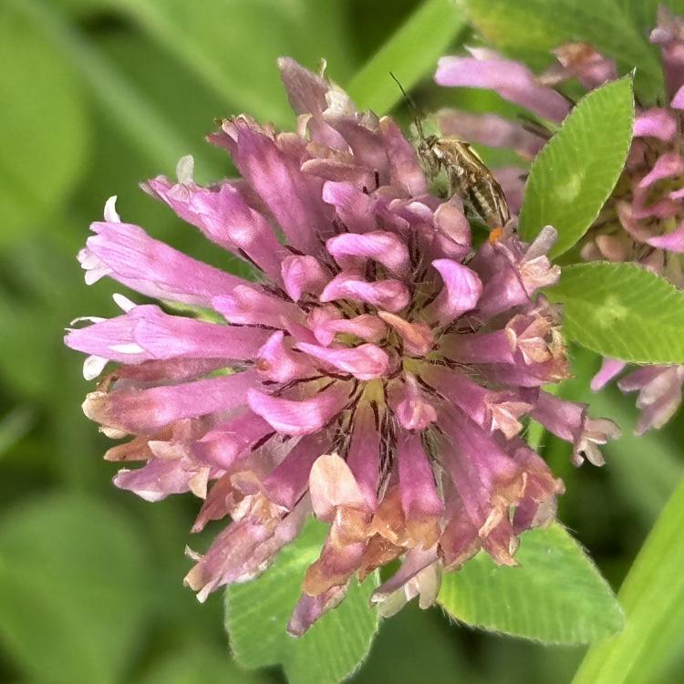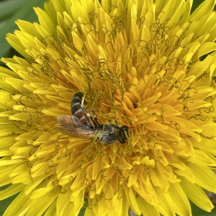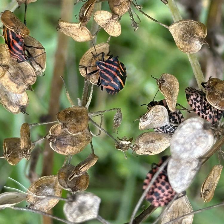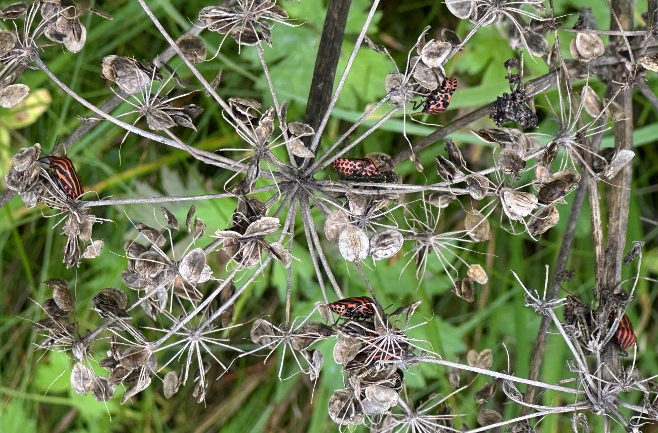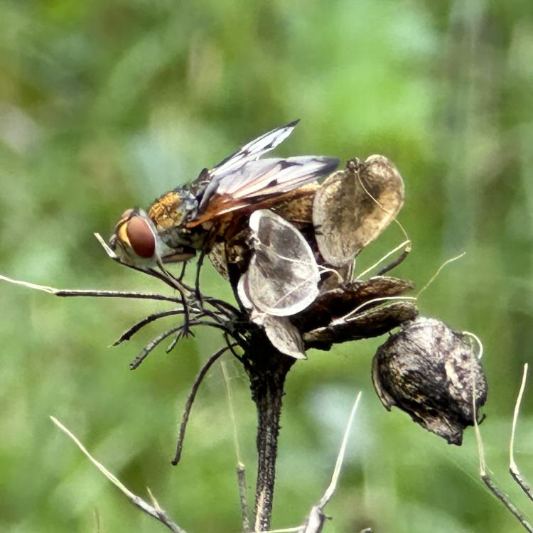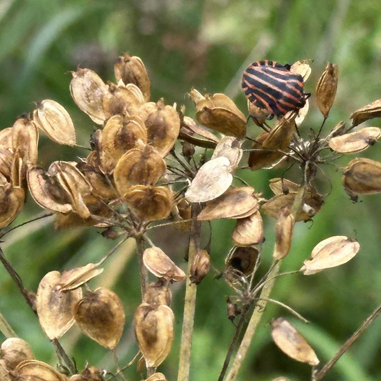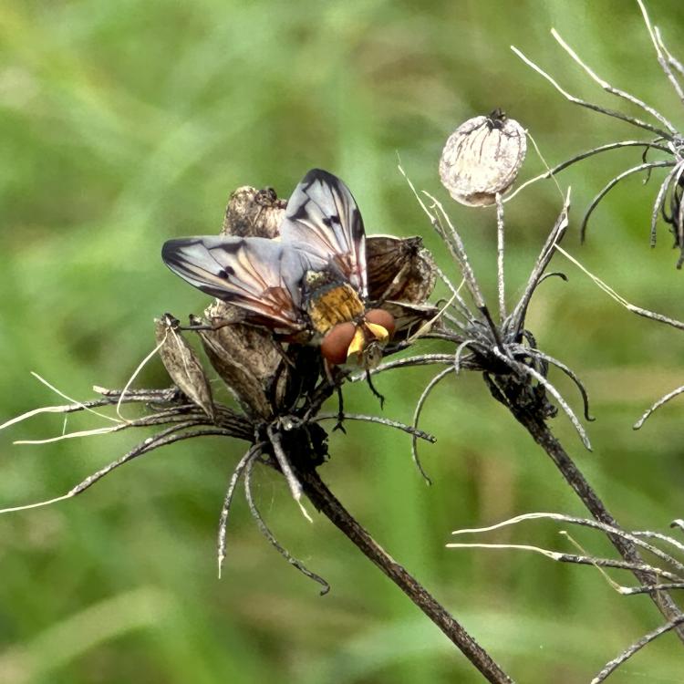 Bei der Sichtung heute eine sehr hübsche und interessante Breitflügelige Raupenfliege gesichtet und auf einem Löwenzahn eine Xenox Tigrinus - Tiger-Hummelfliege oder auch " The Tiger Bee Flee" genannt, die aus den USA und Süd-Ontario stammen soll. (lt.Bestimmungs-App). Eine Gemeine Furchenbiene ist auf einer Löwenzahnblüte zu sehen. Eine Rote Keulenschrecke sitzt im Gras. Ansonsten unzählige Streifenwanzen auf den Samen des Wiesen-Bärenklaus gesichtet, die sie offensichtlich sehr mögen.Eine mysteriöse Wildbiene auf einem Rotklee, eine Listspinne auf einer Distel.
