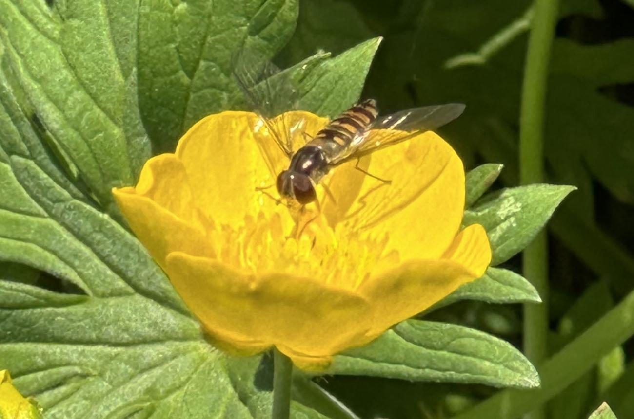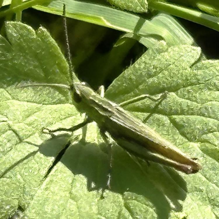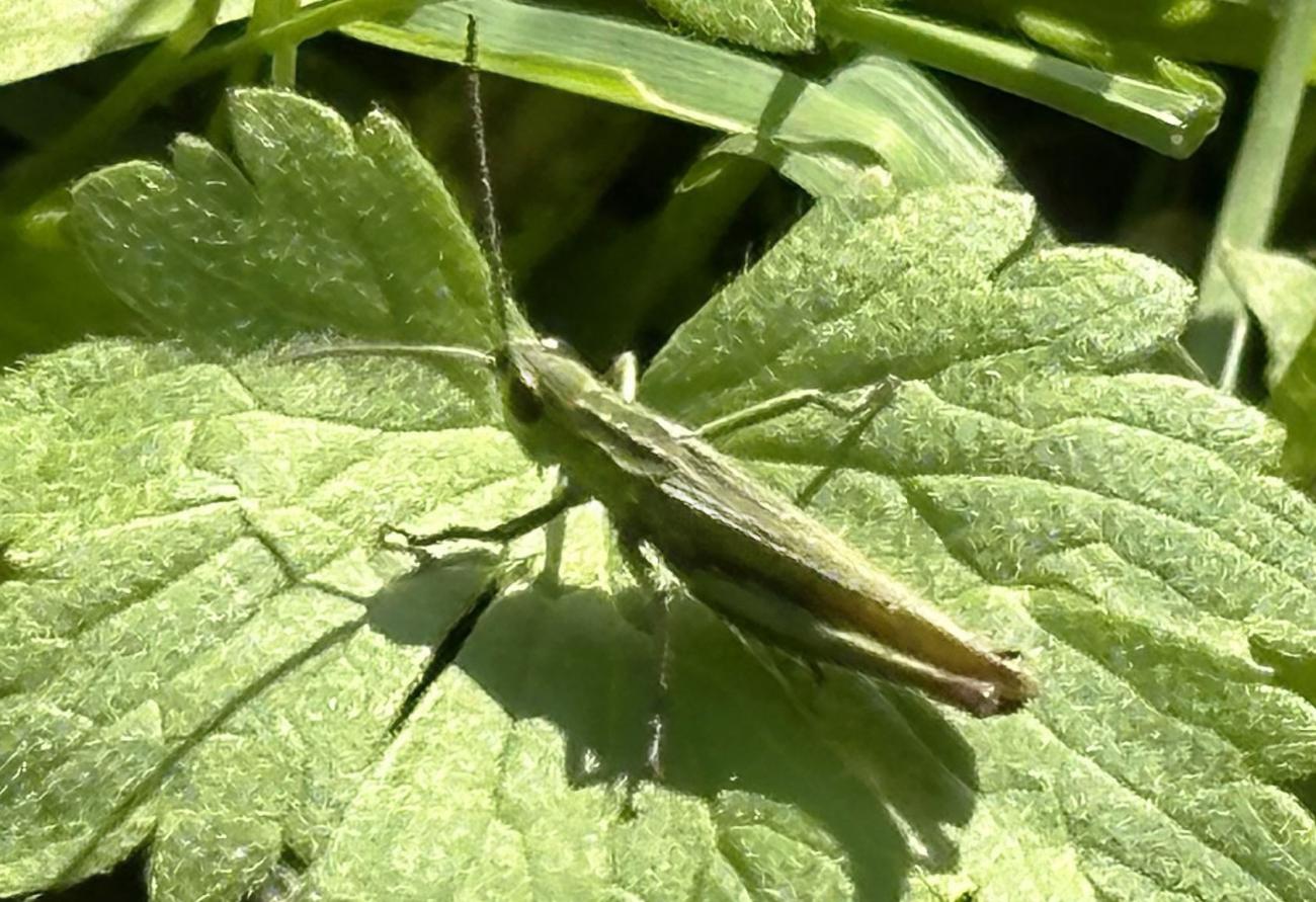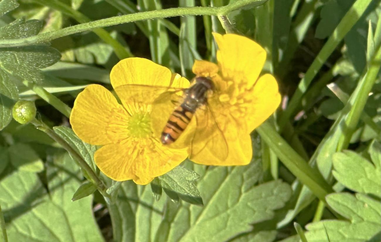 Eine Sichtung mit heute besonders vielen Heuschrecken, Gras-und Wiesenhüpfern. An den Hahnenfußblüten verschiede Schwebfliegen, z.B. die schöne Hainschwebfliege. Eine Ackerhummel ist am Wiesenklee. Mehrere Fliegen zieht der Gemeinen Bärenklau an. Ein Käfer (aus der Gattung der Laufkäfer?) auf einer im Foto undefinierbaren Pflanze.