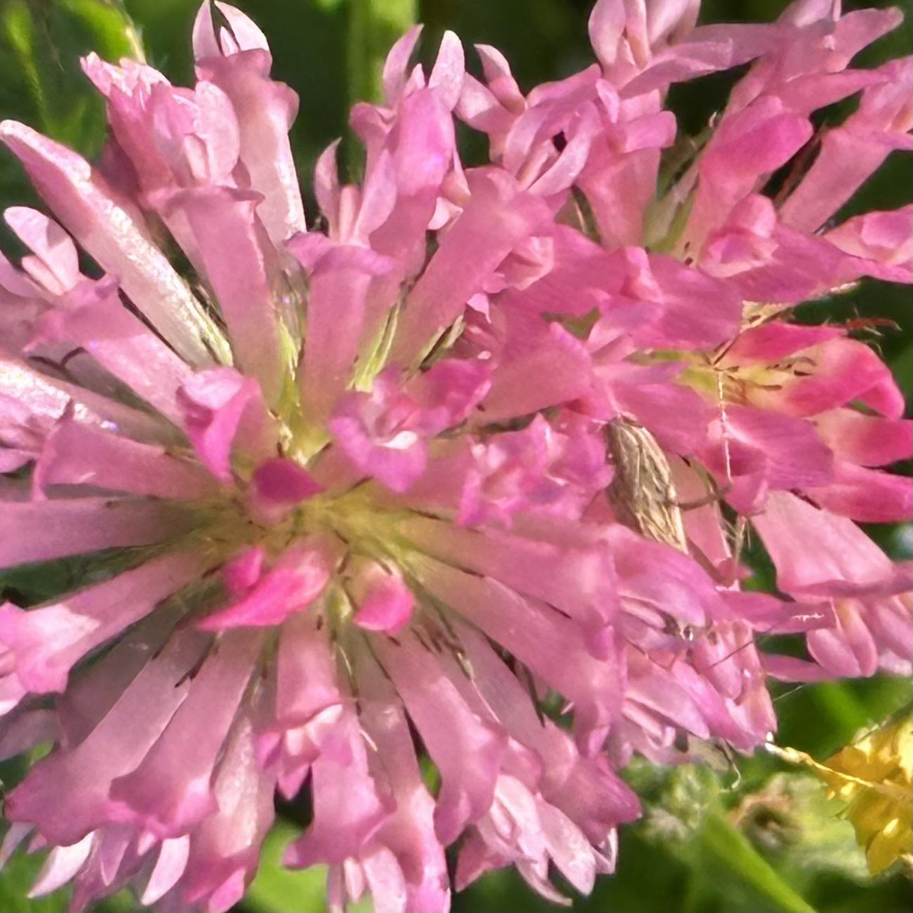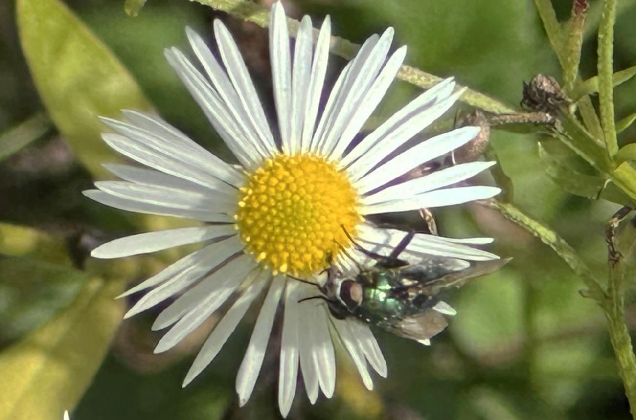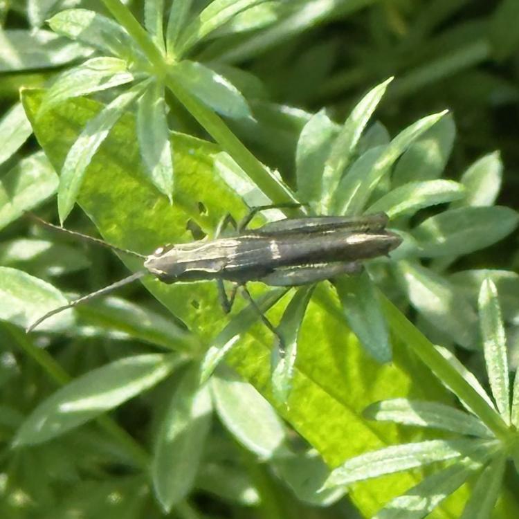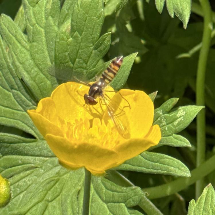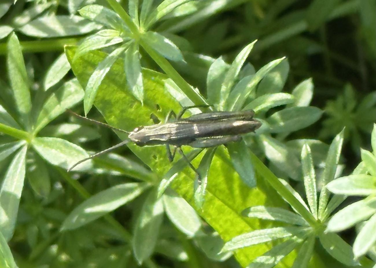 Eine Sichtung mit heute besonders vielen Heuschrecken, Gras-und Wiesenhüpfern. An den Hahnenfußblüten verschiede Schwebfliegen, z.B. die schöne Hainschwebfliege. Eine Ackerhummel ist am Wiesenklee. Mehrere Fliegen zieht der Gemeinen Bärenklau an. Ein Käfer (aus der Gattung der Laufkäfer?) auf einer im Foto undefinierbaren Pflanze.