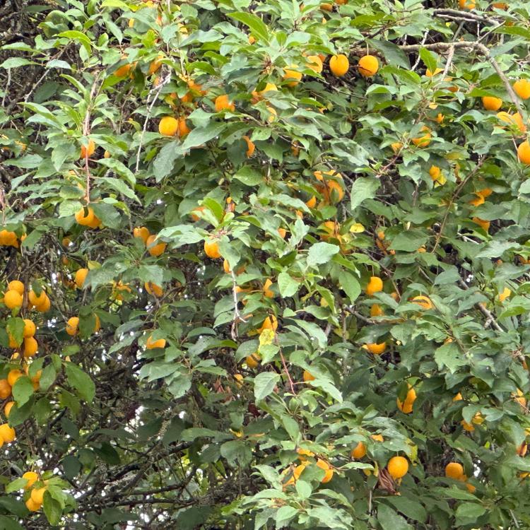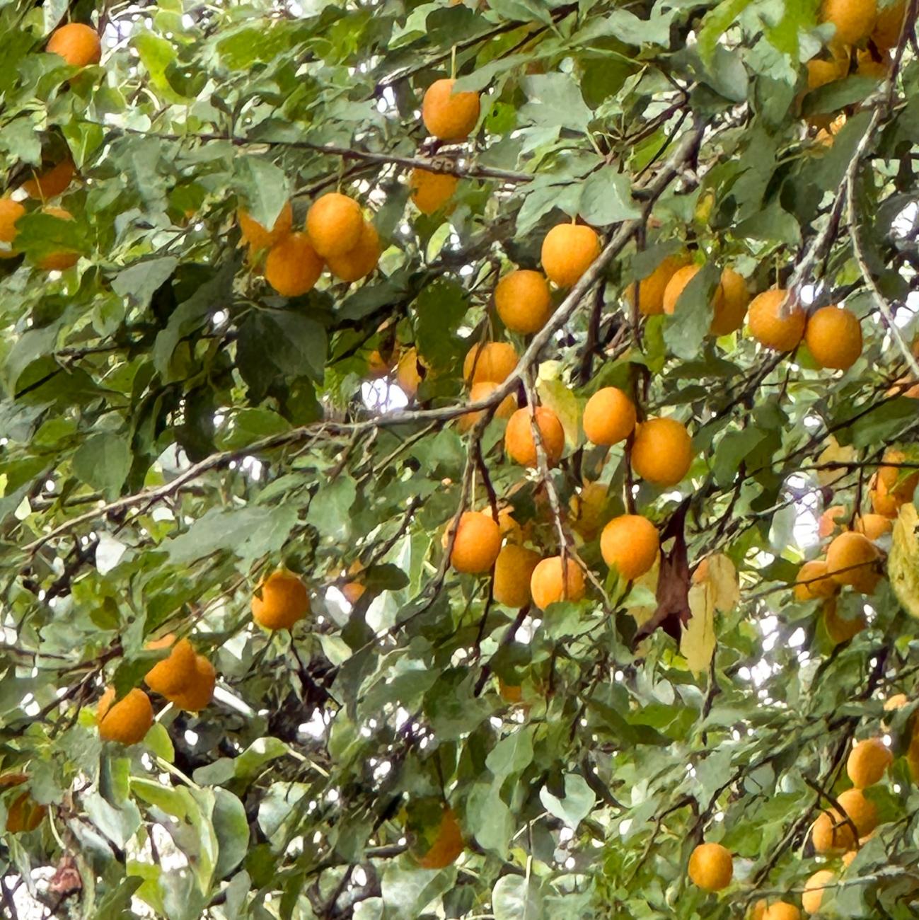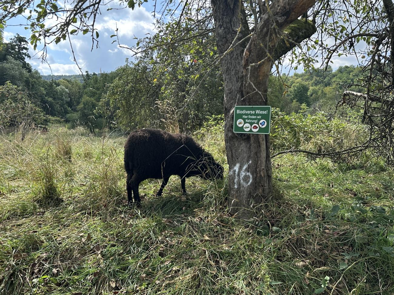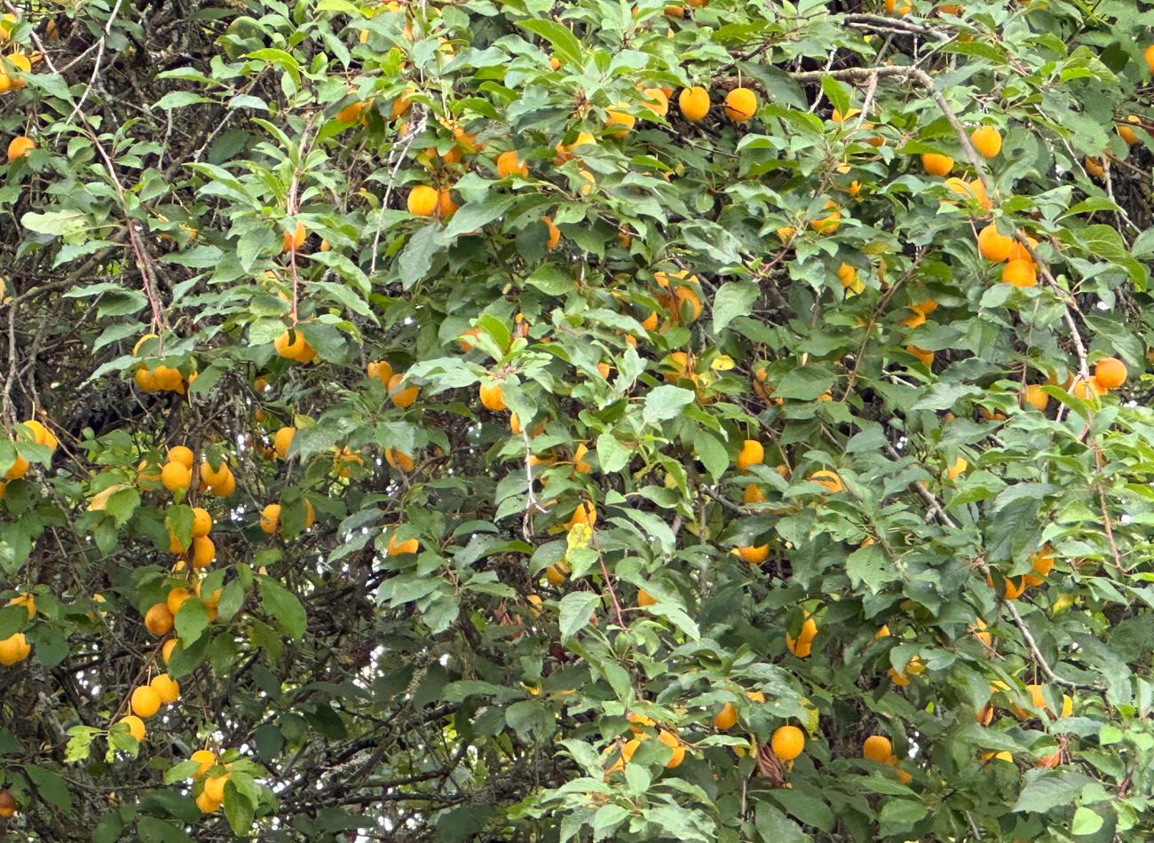 Da das Gebiet der S2 so sehr groß ist, habe ich die umfangreiche Sichtung heute am 24.08. gesplittet. Um 11 Uhr bin ich auf der östl. Seite entlang in Bachnähe gegangen. Später um 12.25 Uhr dann den westlichen Wiesenweg entlang der Einfriedung für die Schafbeweidung. Hier weiden alte seltene Rassen unserer Schäferin. Für mich neu und interessant zu sehen war, dass Schafe die reifen Hagebutten der Hunds-Rosenranken abfressen. Sie wissen wohl, da ist viel Vitamin C darin - und sie schmecken wohl gut. Entlang des Weges liegen auf dem Boden kleine gelbe reife Früchte und der ganze Baum hing voll davon - hier sagt die Erkennung "Haferpflaume" (Prunus insititia), eine andere sagt: Gelbe Kirschpflaume (Prunus cerasifera), die auch als "Wilde Mirabellen " bekannt seien. Es ist in jedem Fall eine gelbe Prunus-Art.
