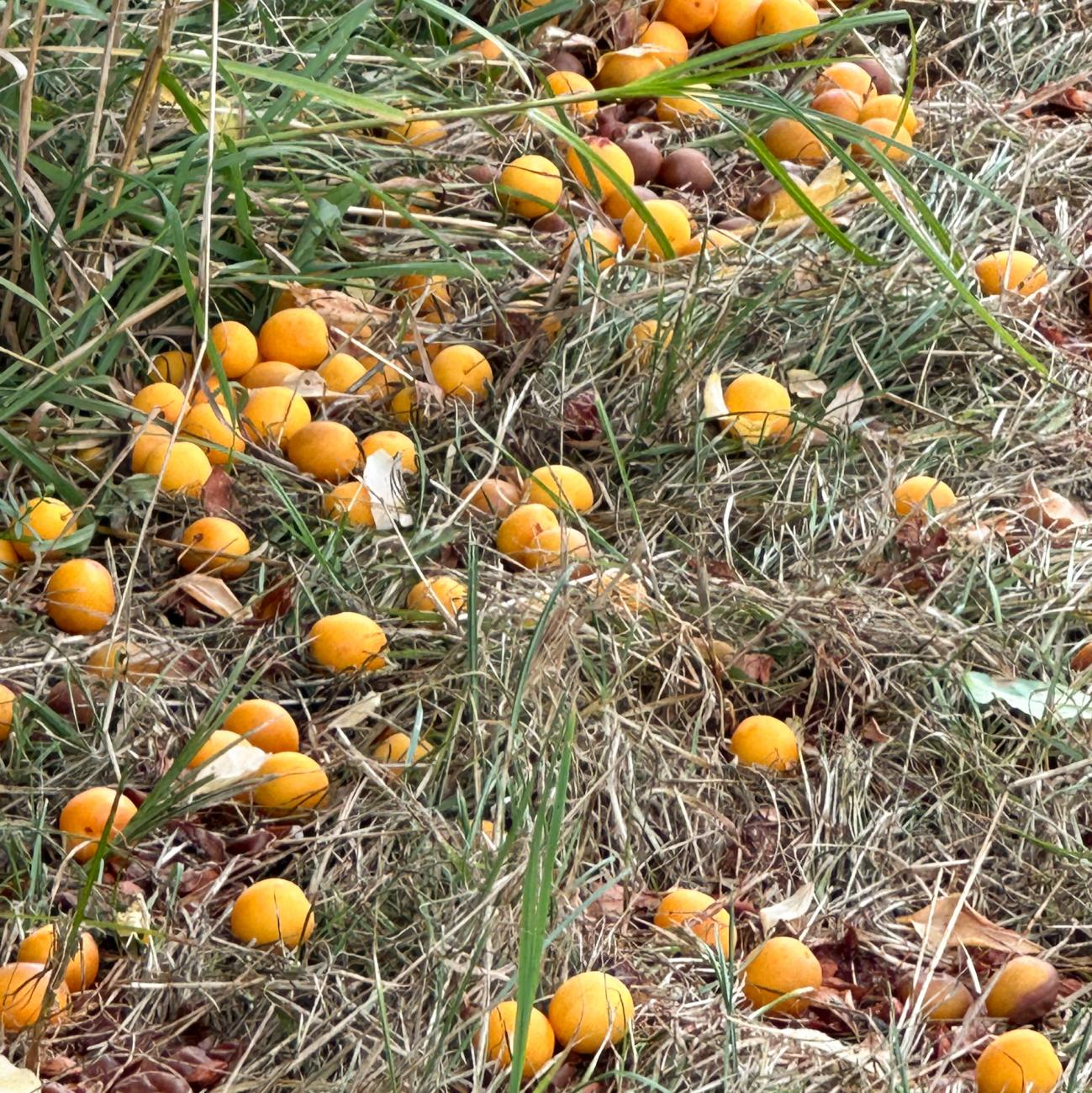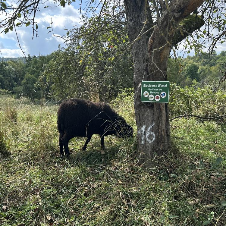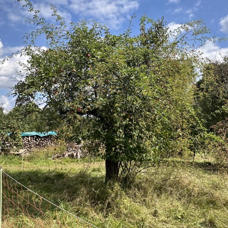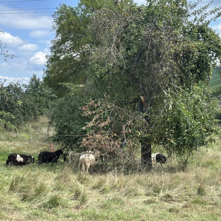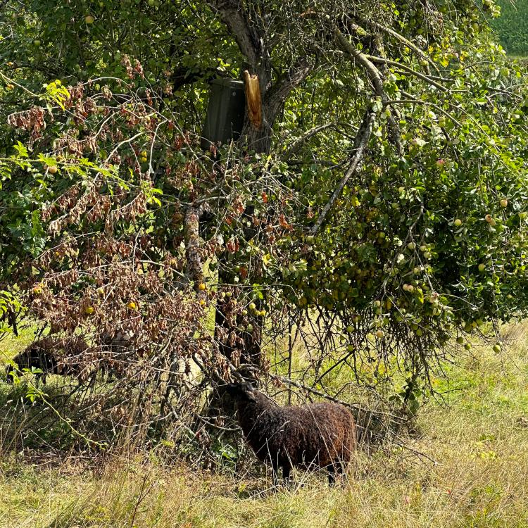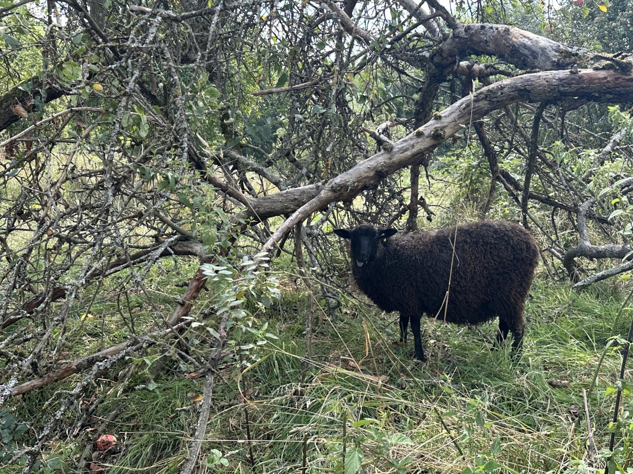 Da das Gebiet der S2 so sehr groß ist, habe ich die umfangreiche Sichtung heute am 24.08. gesplittet. Um 11 Uhr bin ich auf der östl. Seite entlang in Bachnähe gegangen. Später um 12.25 Uhr dann den westlichen Wiesenweg entlang der Einfriedung für die Schafbeweidung. Hier weiden alte seltene Rassen unserer Schäferin. Für mich neu und interessant zu sehen war, dass Schafe die reifen Hagebutten der Hunds-Rosenranken abfressen. Sie wissen wohl, da ist viel Vitamin C darin - und sie schmecken wohl gut. Entlang des Weges liegen auf dem Boden kleine gelbe reife Früchte und der ganze Baum hing voll davon - hier sagt die Erkennung "Haferpflaume" (Prunus insititia), eine andere sagt: Gelbe Kirschpflaume (Prunus cerasifera), die auch als "Wilde Mirabellen " bekannt seien. Es ist in jedem Fall eine gelbe Prunus-Art.