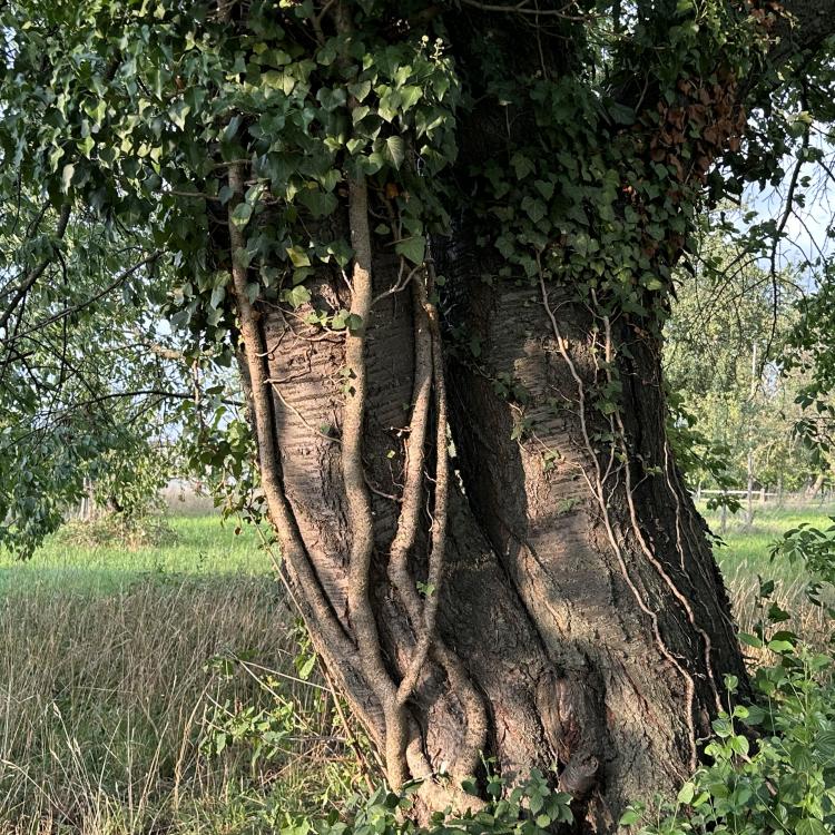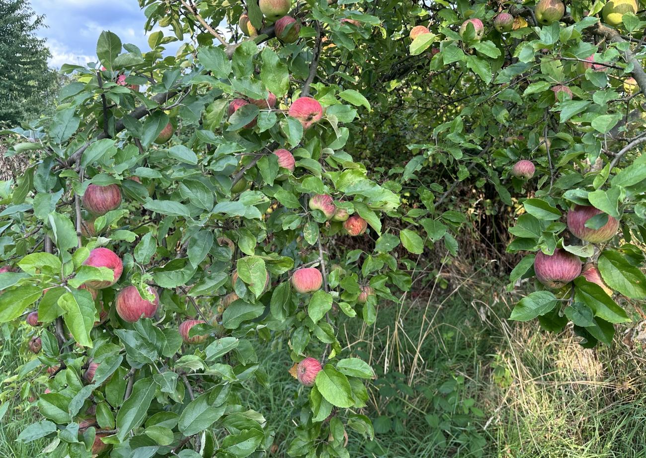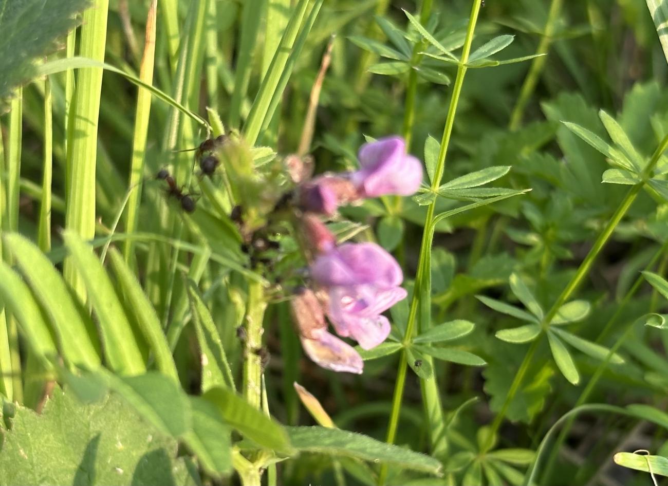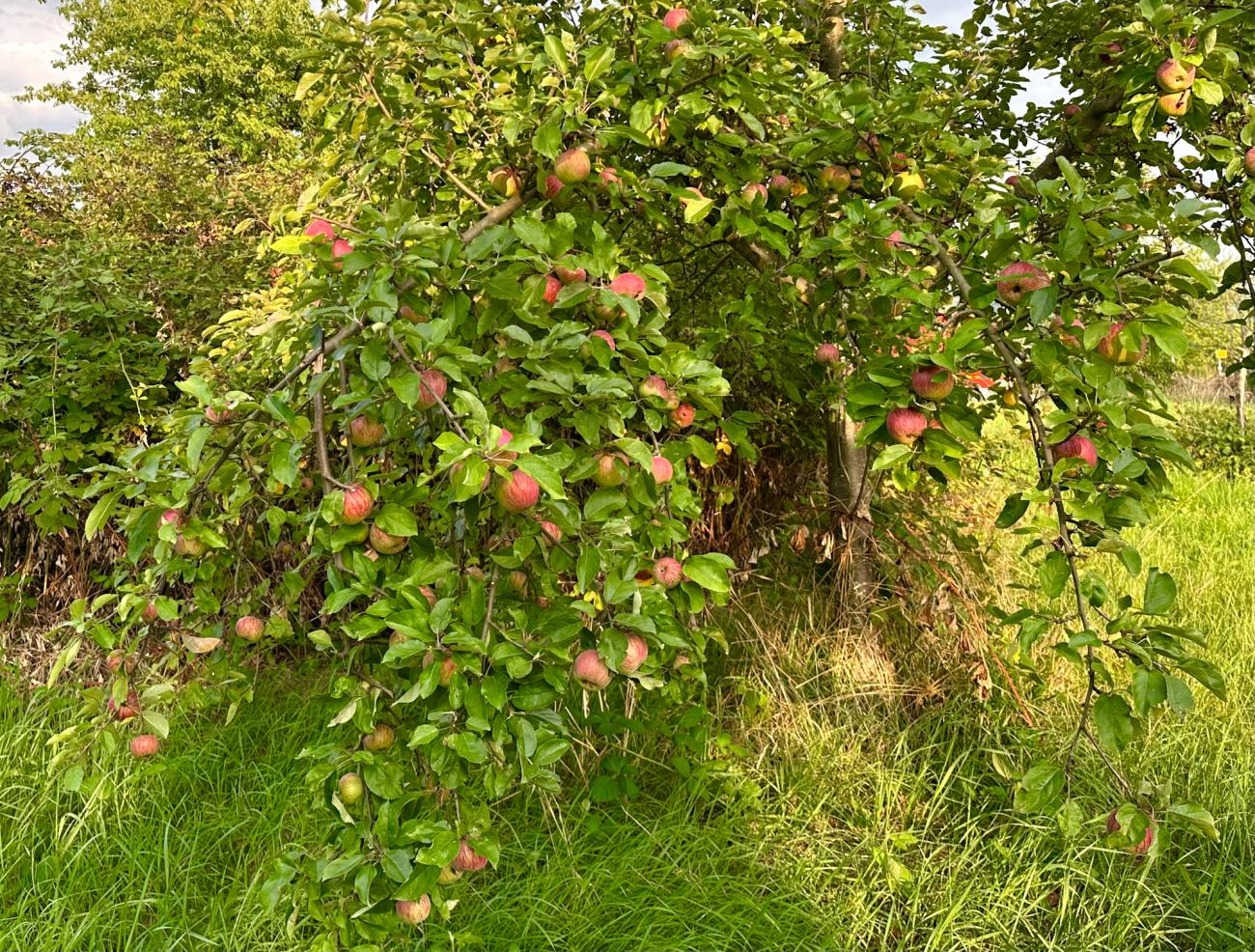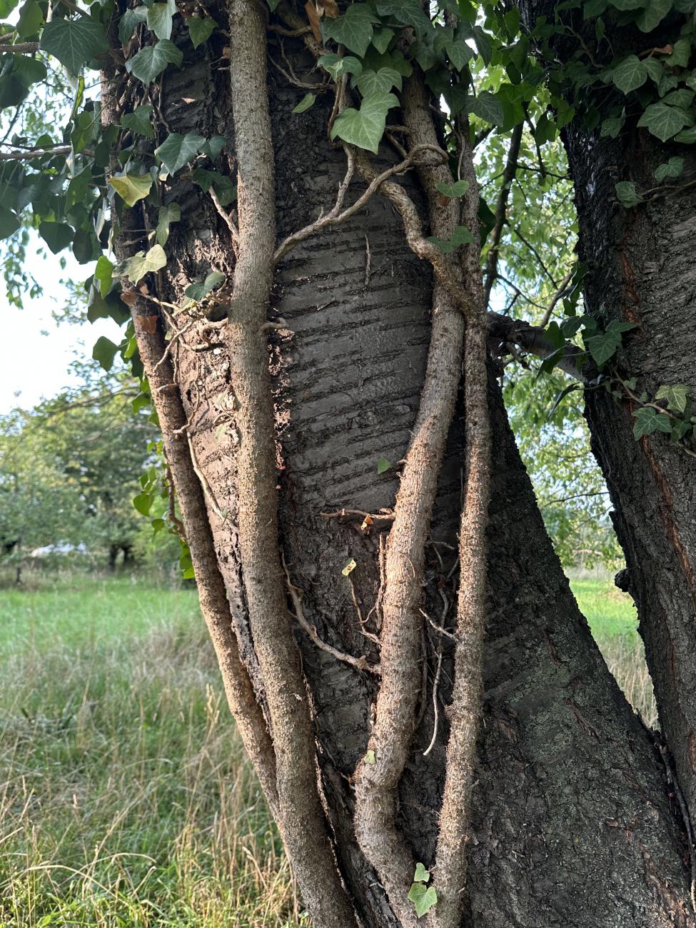 Mitte August eine abendliche Sichtung. Es sind ja zur Zeit nicht mehr viel an blühenden Pflanzen auf der Fläche. Ein weißer Schmetterling, der auf der Außenseite eine graue Zeichnung besitzt, ein Senfweißling (Leptidea sinapsis) scheint alle Blüten zu mögen und sitzt sowohl auf der Zaunwicke, wie auch auf dem Hornklee und sucht auch am Weißen Labkraut nach Nektar. Ein schwarzer kleiner Rüsselkäfer sitzt auf der Storchschnabel-Blüte. Schöne Äpfel überall an den Bäumen. Die Efeustränge am großen alten Kirschbaum haben mittlerweile Armstärke. Manchmal frage ich mich, ob so ein starker Efeu das Potential hat diesen mächtigen und äußerst vitalen Kirschbaum zu schwächen und gar zu zerstören?!