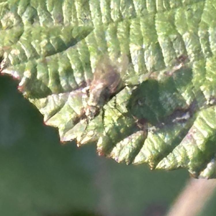 Eine Heuschrecke sonnt sich auf einem Brombeerblatt. Sie ist perfekt durch Form und Farbe getarnt. Man muss sehr genau hinschauen! Ich wollte die Art per I-Phone-Bestimmungs-App bestimmen, aber das Lustige ist, dass die KI die Heuschrecke auf dem Blatt nicht mal als ein Insekt erkennen kann - und nur die Pflanze anzeigt. Perfekt getarnt eben!