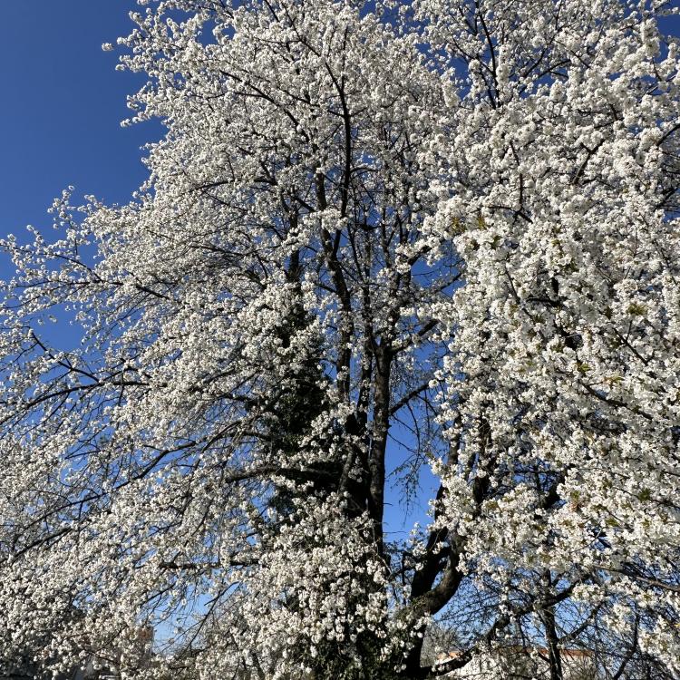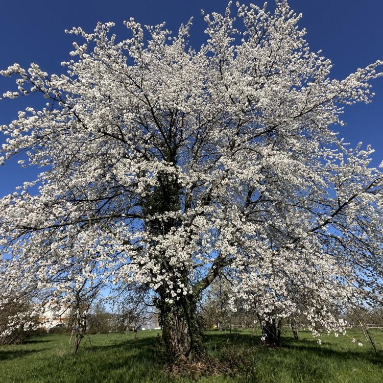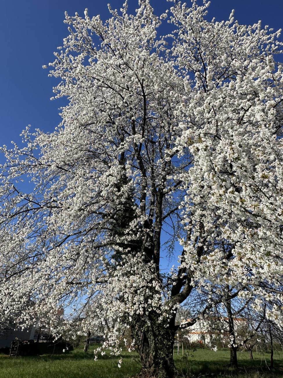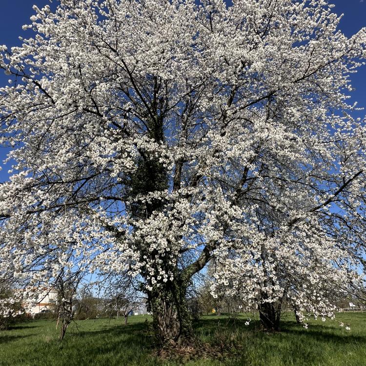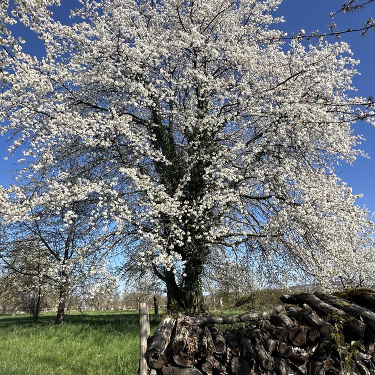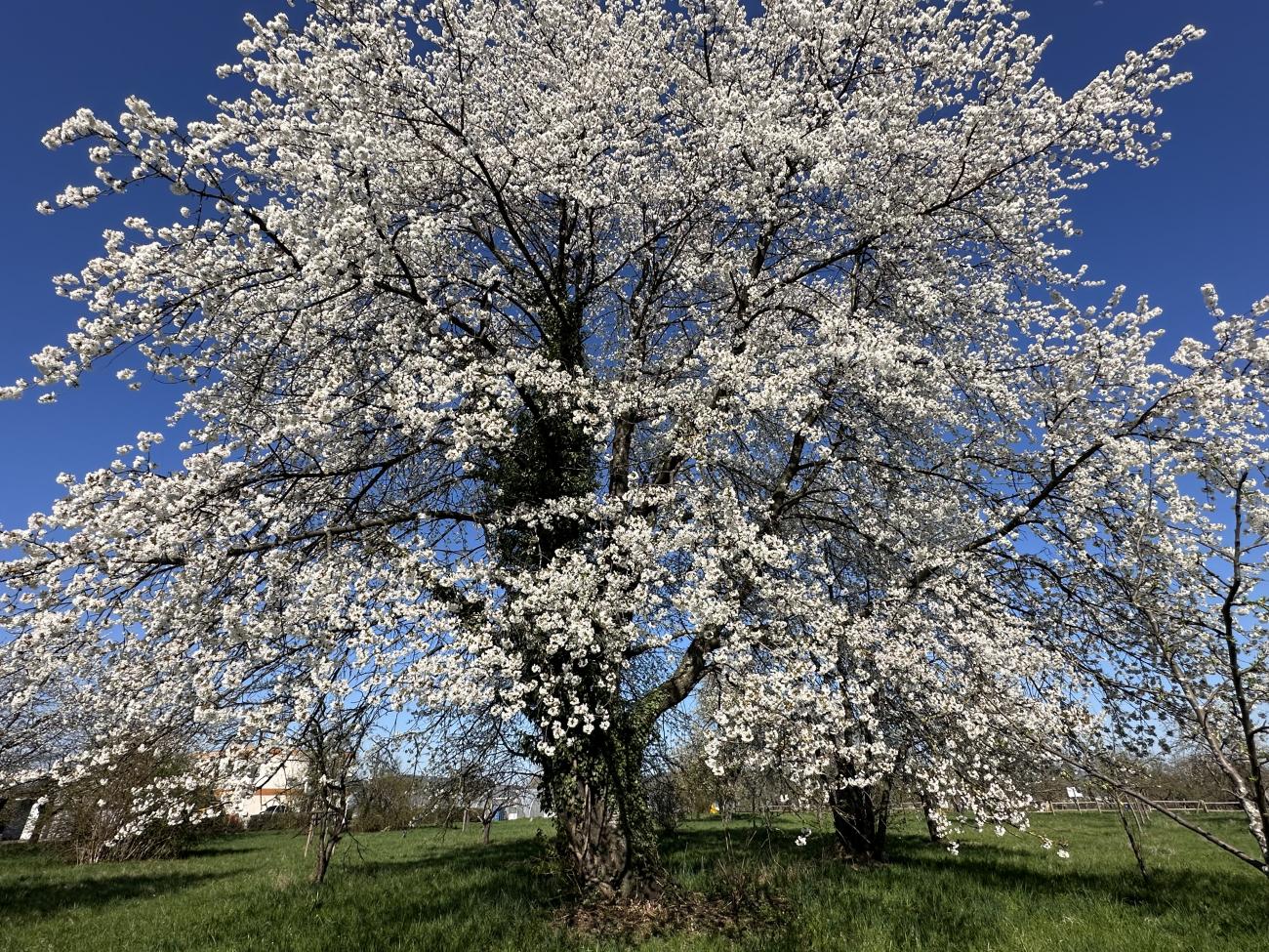 Auf der Musterfläche R7 steht ein sehr alter und riesengroßer Kirschbaum. Eine Süßkirsche, ich denke, dass das der größte und prächtigste Kirschbaum von ganz Kernen ist. Jedes Jahr entfacht er seine überbordende Blütenpracht mit gefühlt hunderttausenden weißer Blütentupfer vor dem blauen Frühlingshimmel.