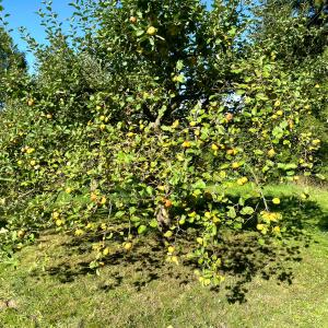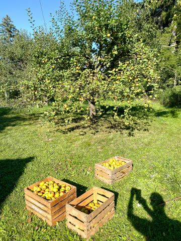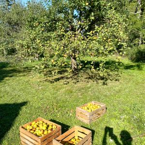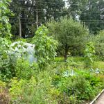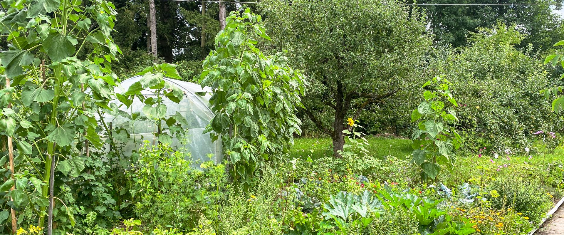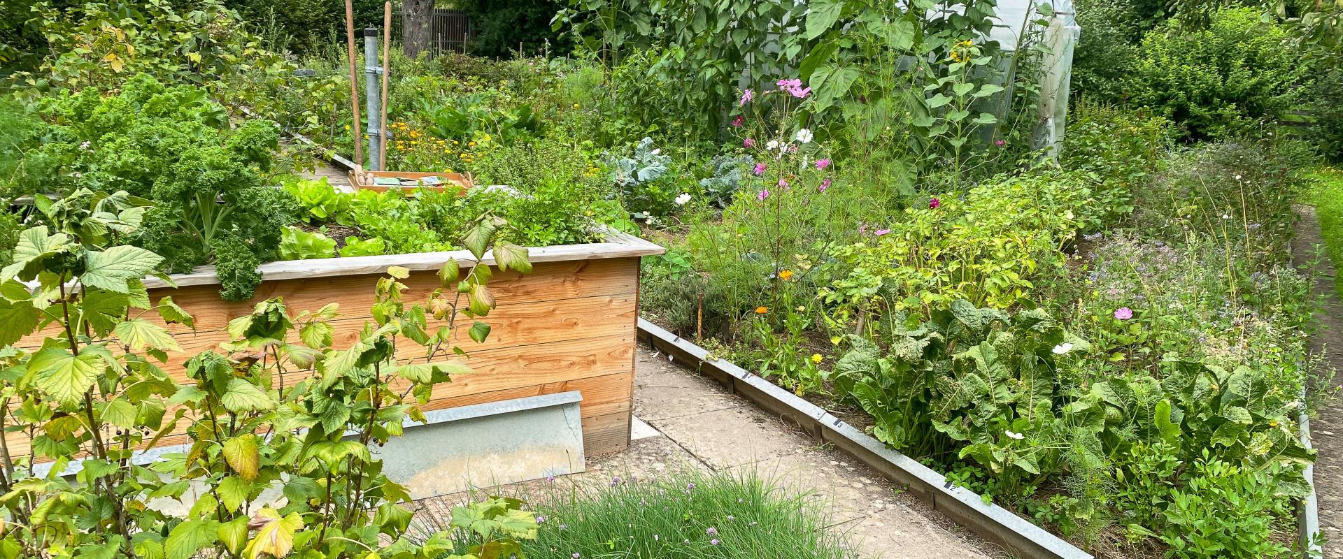 Ein Teil des Gartens wird zum Gemüseanbau verwendet, Wiesenflächen werden gemäht und das Mähgut als Mulchmaterial im Anbaubereich verwendet.