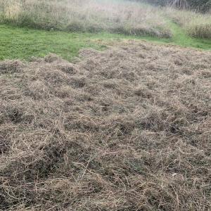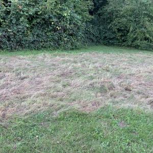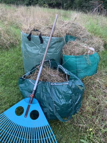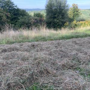 Auf meinem Grundstück habe ich Blühflächen mit insgesamt ca. 50 qm. Die anderen Flächen lasse ich ganzjährig wachsen. Nur dazwischen mähe ich mit dem Rasenmäher Wege. Die ganzjährigen Flächen sense ich per Hand einmal im Jahr. Ich lasse den Schnitt je nach Wetter ein paar Tage trocknen und bringe dann das gesamte Heu Eseln. Mein Hund passt auf, dass ich alles richtig mache. :-)