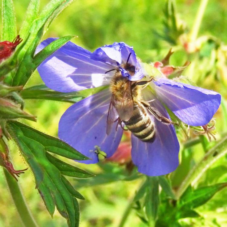 In einer Blüte der Herbstzeitlosen ist ein winziges Insekt - kaum zu erkennen. Honigbienen fliegen die Storchschnabel-Blüten und finden da noch Nahrung an diesem Herbsttag.
