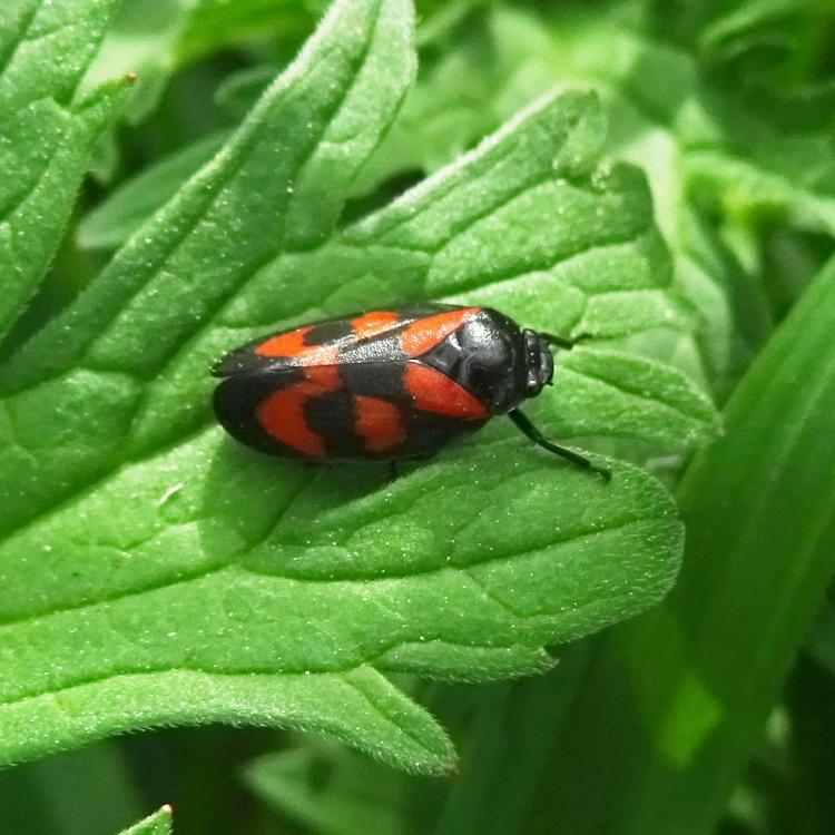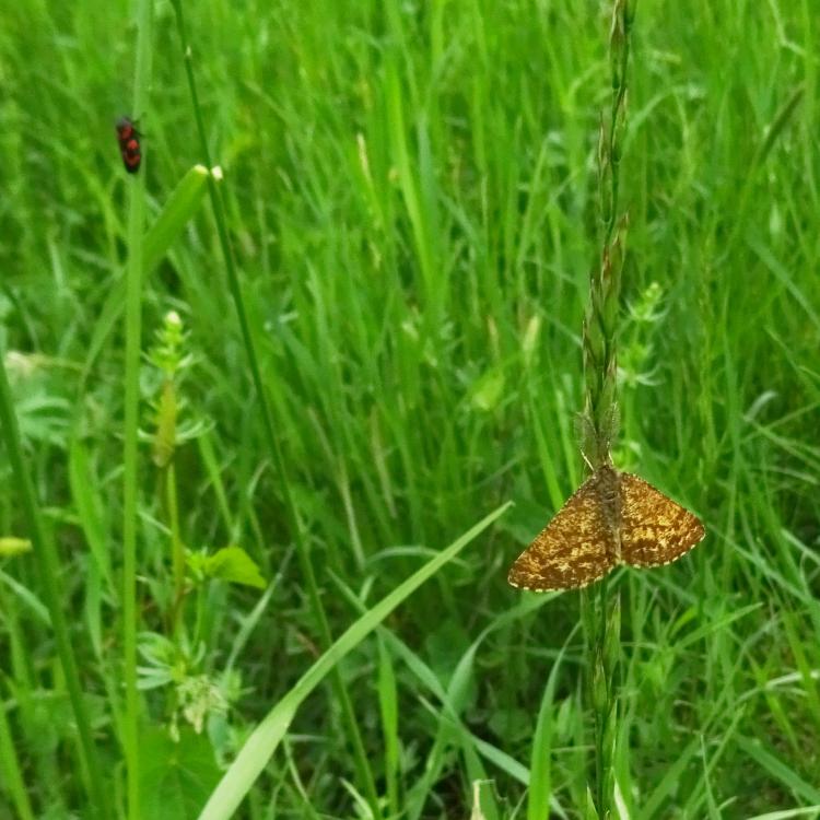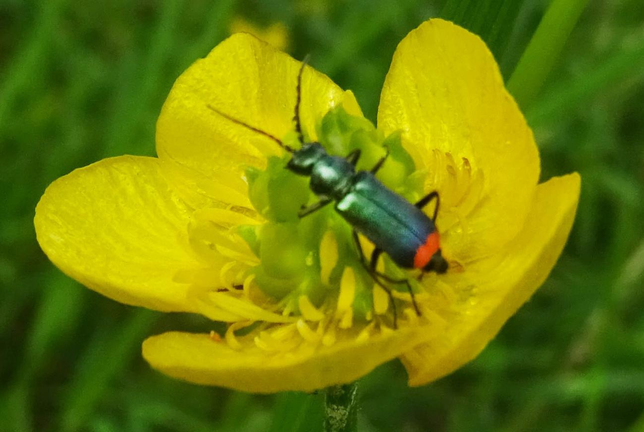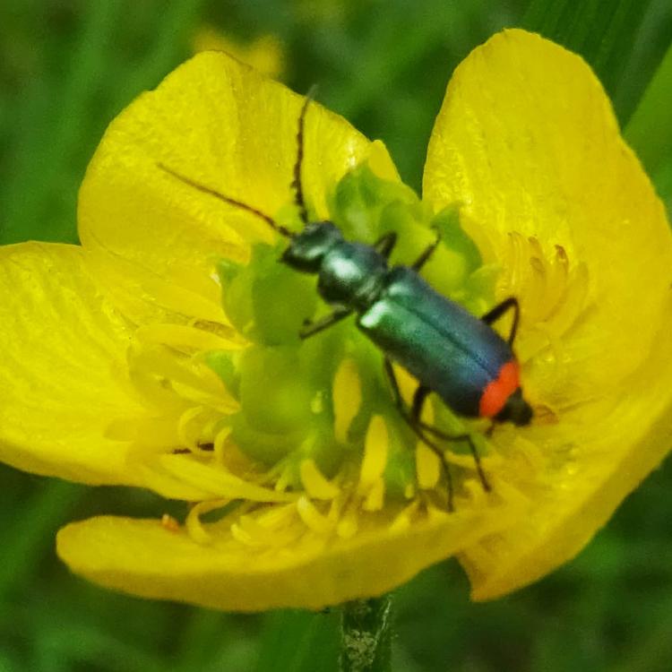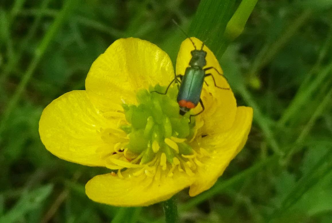Heute eine Gemeine Feuerwanze gesehen mit ihrem schönen Panzer, aber das Highlight heute in der Sichtung war für mich meine erste Sichtung von Blutzykaden. Aber ebenso so interessant für mich war der Zweifleckige Zipfelkäfer auf der Scharfen Hahnenfußblüte, ganz grün und hinten diese rote Färbung. Heute war ein eher kühler Tag, deswegen waren ein Labkrautspanner und ein Heidespanner unterwegs, meist im Gras, aber auch auf dem Werbetransparent auf der Musterfläche R1. Und viele verschiedene Fligen, darunter auch eine gelb-schwarze Schwebfliege. Evtl. auch eine Raubfliege mit Beute, da ist das Foto aber etwas unklar.