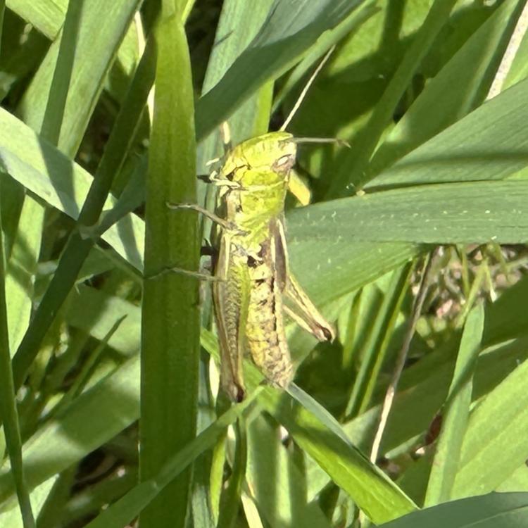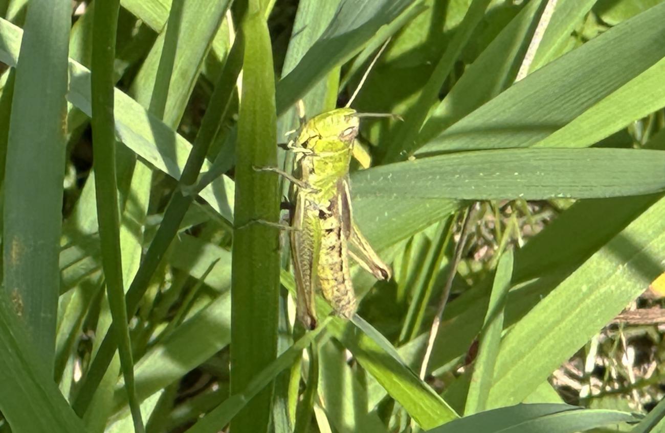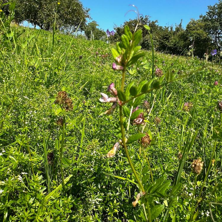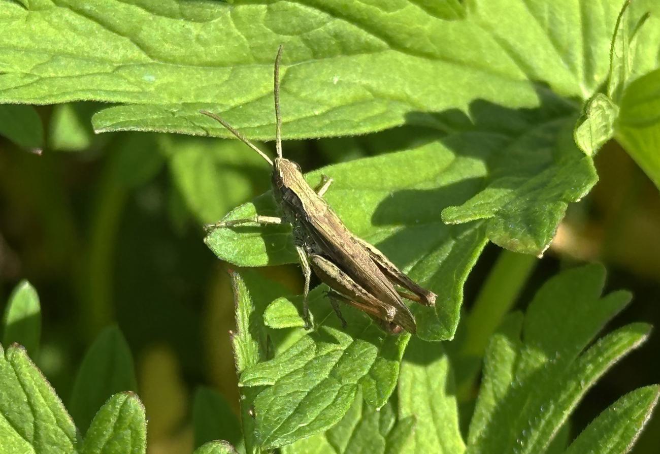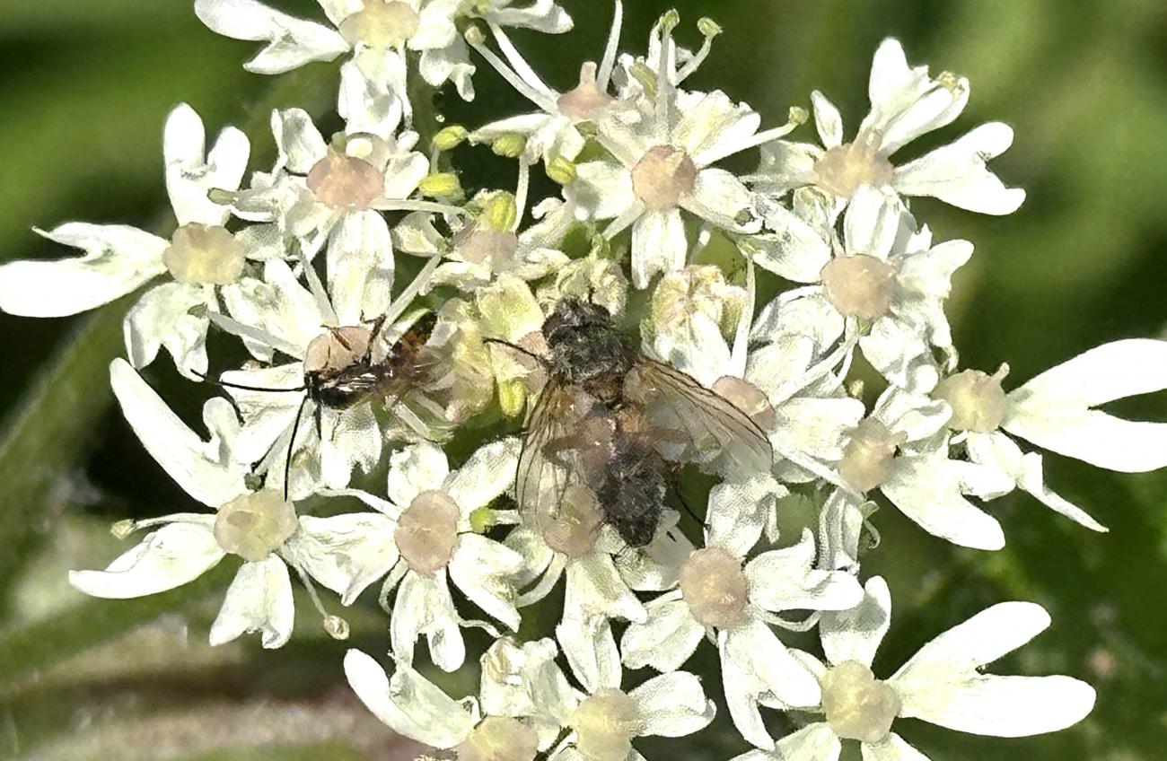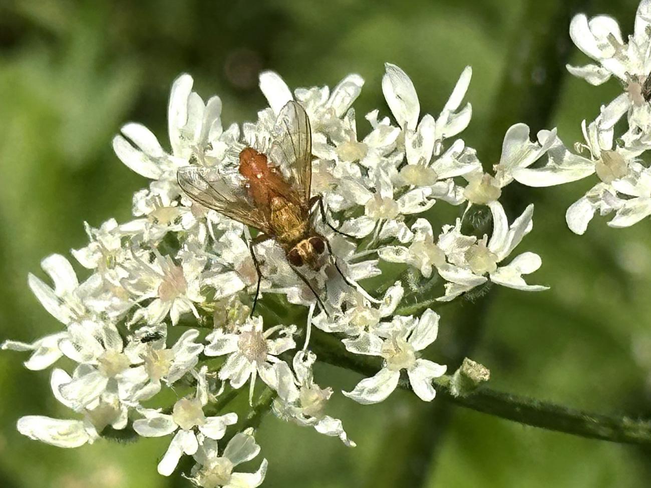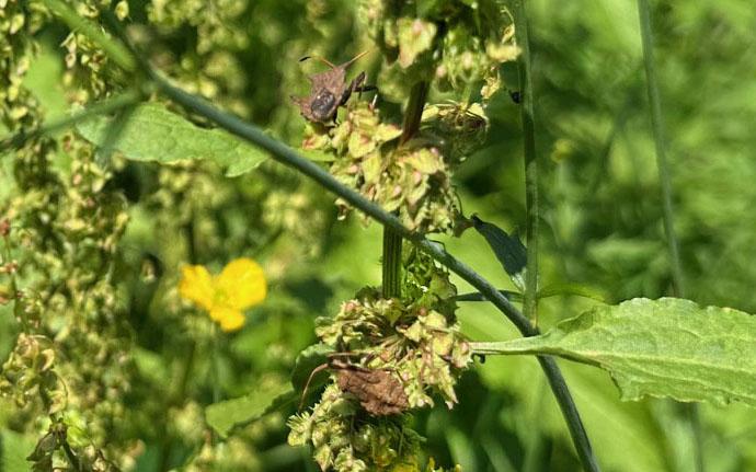 Die neu hinzugekommene Musterfläche ist sehr vielfältig mit sehr verschiedenen Pflanzenarten, die hier vorkommen. Entsprechend ist auch die Insektenvielfalt groß. Besonders interessant war auf einer rosa Ackerwinde ein schwarz-weißes Windeulchen (Emmelia trabealis) zu sehen, was ich überhaupt hier zum 1.Mal sah. Dann zwei braune Rautenwanzen auf eiinem Wiesen-Sauerampfer. Auf dem Gemeinen Bärenklau eine rötlich-goldfarbene Fliege, die ich nicht bestimmen konnte. Insgesamt sehr viele Schmetterlinge, Wanzen und Heuschrecken.