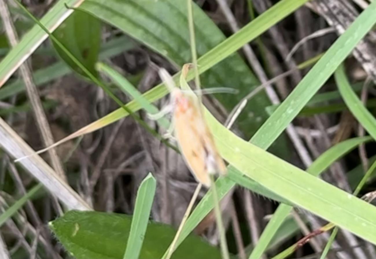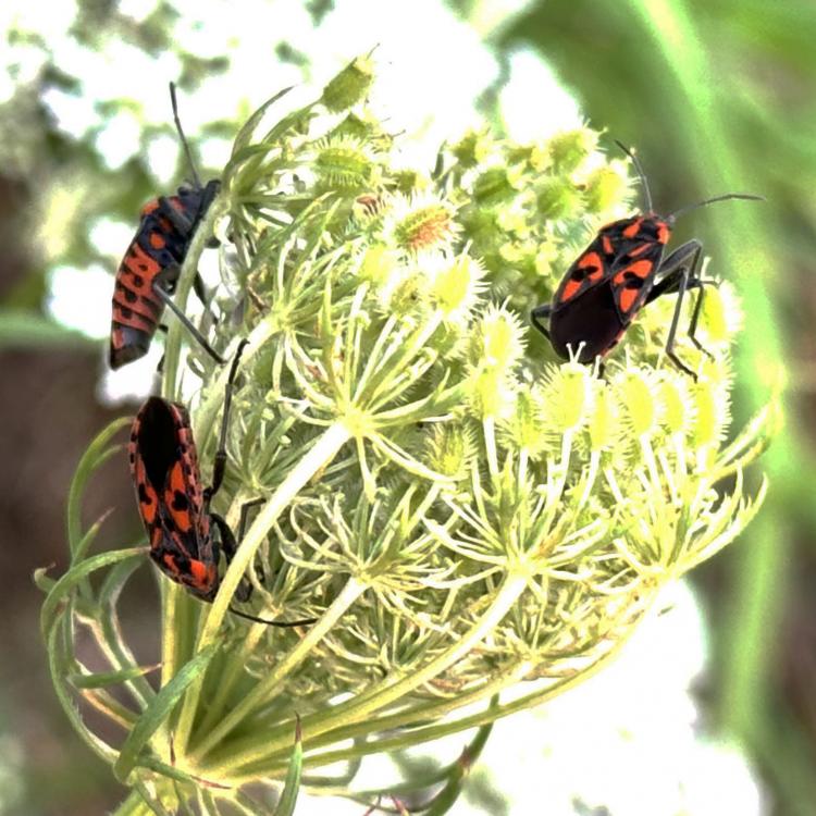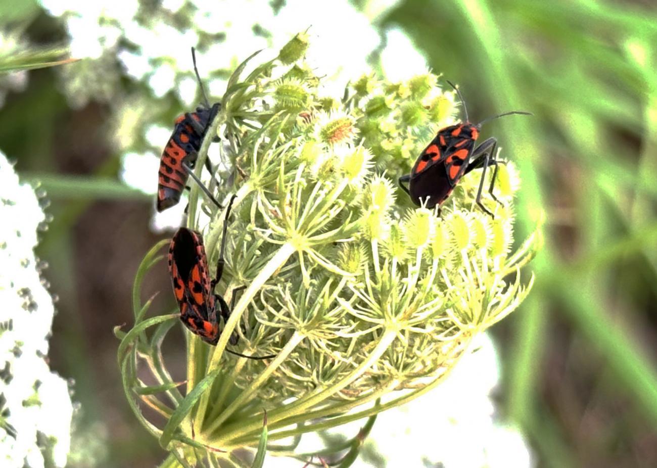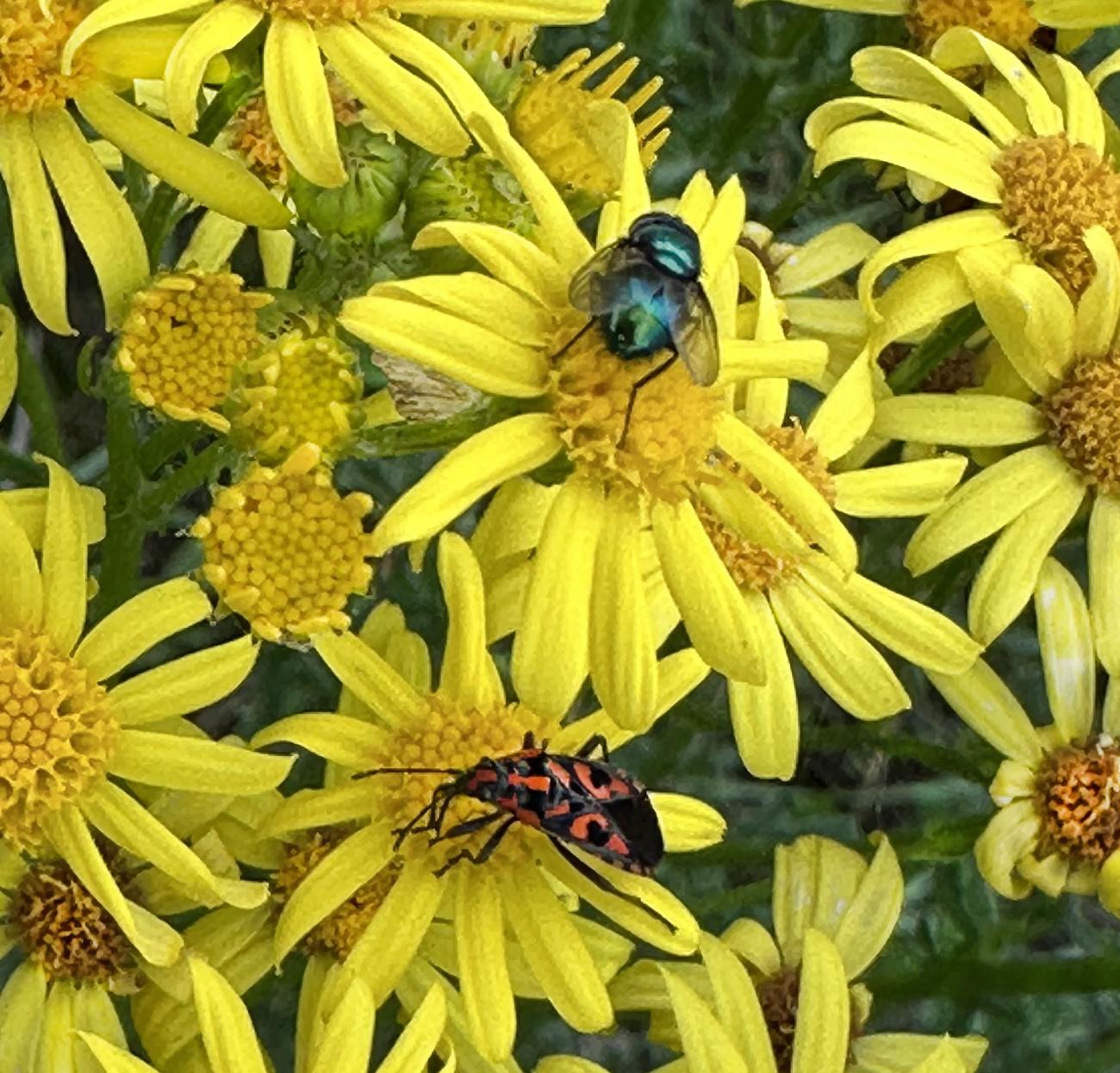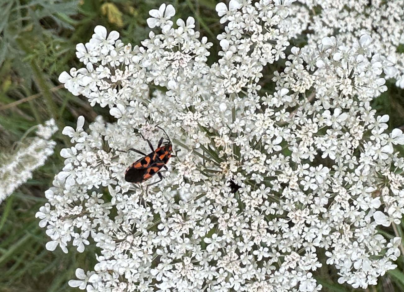 Es stehen noch einige Jakobs-Kreuzkräuter auf der Musterfläche. Wir lassen sie den Insekten, solange sie nicht beginnen sich zu versamen. Dann müssen sie weg. Das Highlight heute darauf war das scharz-weiße Ackerwinden-Bunteulchen (Acontia Trabealis). Vorher noch nie gesehen, sehr schön! Außerdem ist auf dem Jakobs-Kreuzkraut auch oft die Kinderstube der Knappen, auch Stein-Ritterwanze genannt zu sehen. Wie auch oft auf der Wilden Möhre. Auf einem Foto hier sind sowohl Knappen plus eine Streifenwanze zu sehen. Auf anderen Samenständen juvenile Feuerwanzen. bei schwindendem Licht noch einen Rotrandbär gesichtet (Foto unscharf). Ein Exemplar davon habe ich auch hier im letzten Jahr gesehen. Eine Kronwicke hat sich vom Nachbargrundstück (R7) jetzt hierher versamt.