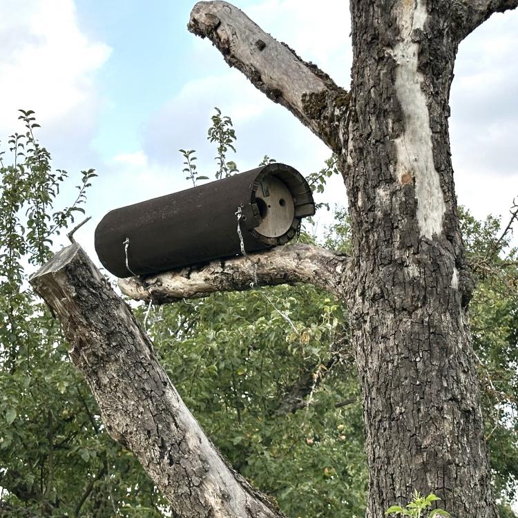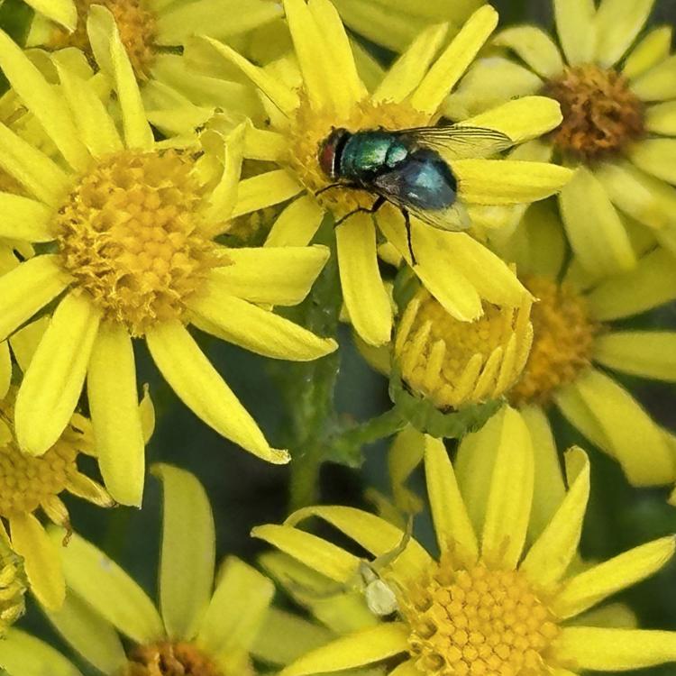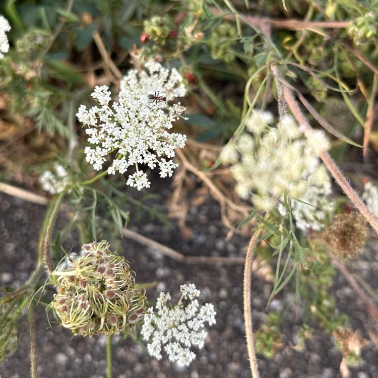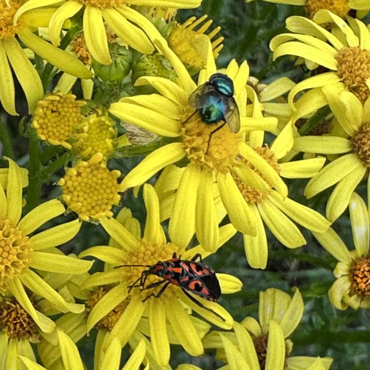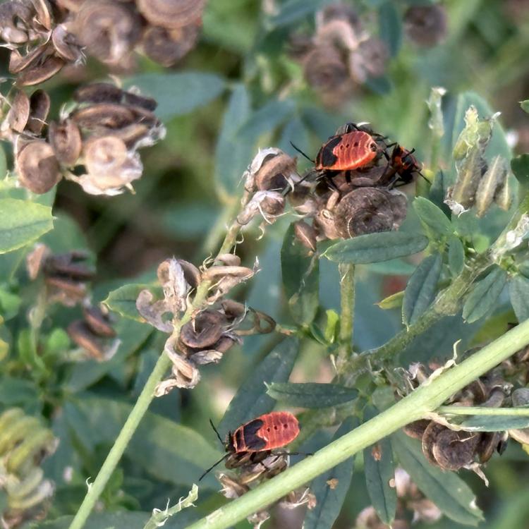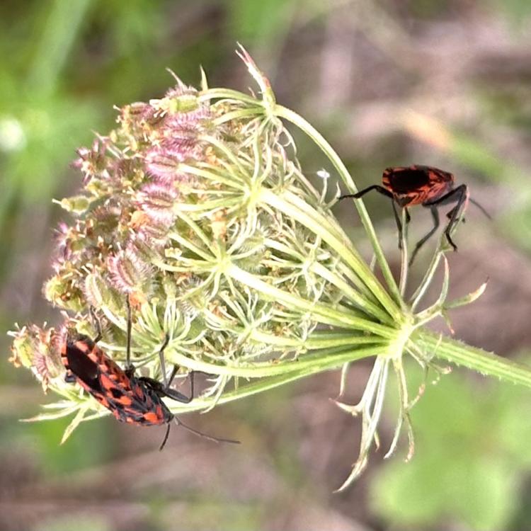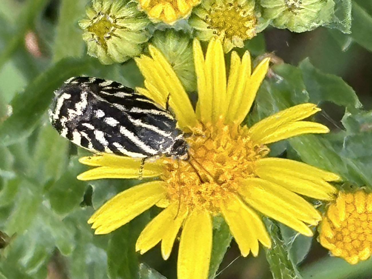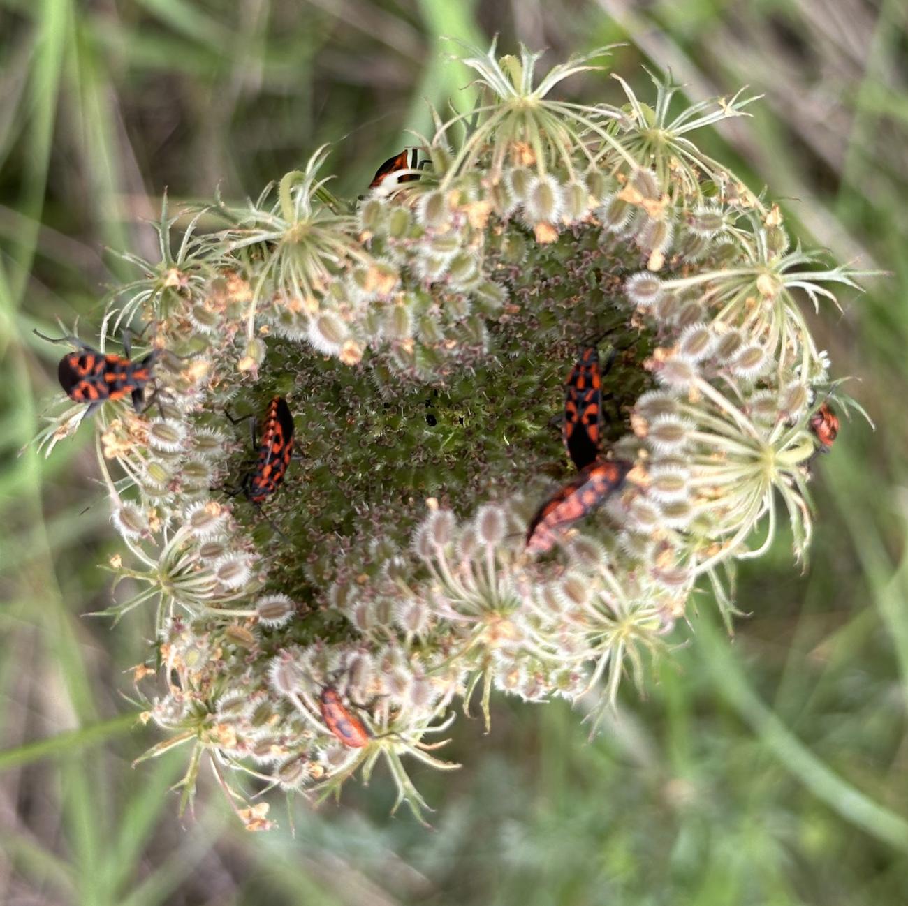 Es stehen noch einige Jakobs-Kreuzkräuter auf der Musterfläche. Wir lassen sie den Insekten, solange sie nicht beginnen sich zu versamen. Dann müssen sie weg. Das Highlight heute darauf war das scharz-weiße Ackerwinden-Bunteulchen (Acontia Trabealis). Vorher noch nie gesehen, sehr schön! Außerdem ist auf dem Jakobs-Kreuzkraut auch oft die Kinderstube der Knappen, auch Stein-Ritterwanze genannt zu sehen. Wie auch oft auf der Wilden Möhre. Auf einem Foto hier sind sowohl Knappen plus eine Streifenwanze zu sehen. Auf anderen Samenständen juvenile Feuerwanzen. bei schwindendem Licht noch einen Rotrandbär gesichtet (Foto unscharf). Ein Exemplar davon habe ich auch hier im letzten Jahr gesehen. Eine Kronwicke hat sich vom Nachbargrundstück (R7) jetzt hierher versamt.
