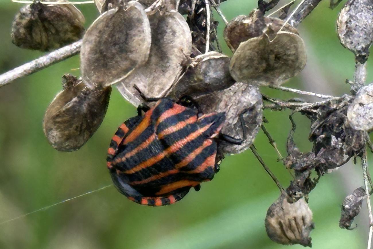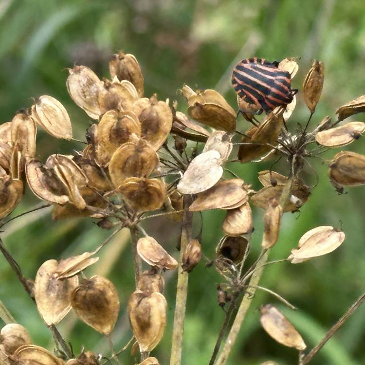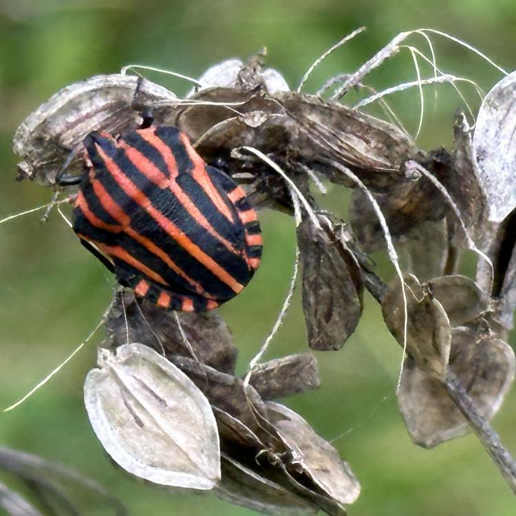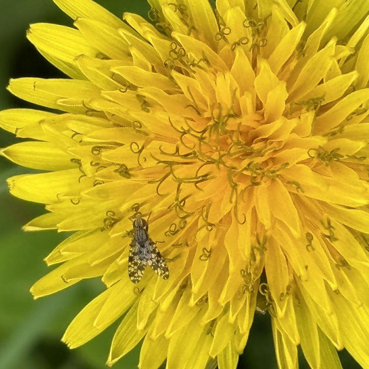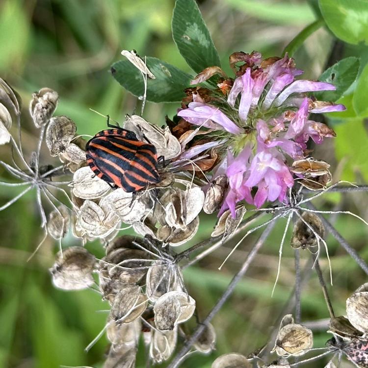 Bei der Sichtung heute eine sehr hübsche und interessante Breitflügelige Raupenfliege gesichtet und auf einem Löwenzahn eine Xenox Tigrinus - Tiger-Hummelfliege oder auch " The Tiger Bee Flee" genannt, die aus den USA und Süd-Ontario stammen soll. (lt.Bestimmungs-App). Eine Gemeine Furchenbiene ist auf einer Löwenzahnblüte zu sehen. Eine Rote Keulenschrecke sitzt im Gras. Ansonsten unzählige Streifenwanzen auf den Samen des Wiesen-Bärenklaus gesichtet, die sie offensichtlich sehr mögen.Eine mysteriöse Wildbiene auf einem Rotklee, eine Listspinne auf einer Distel.