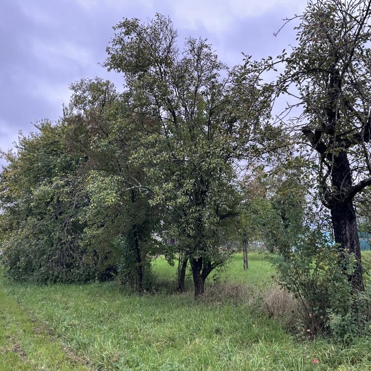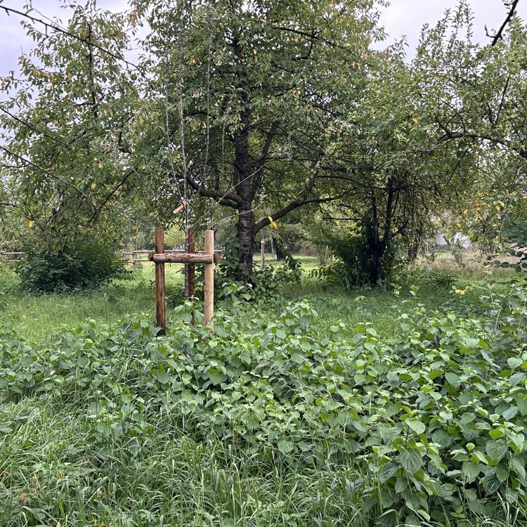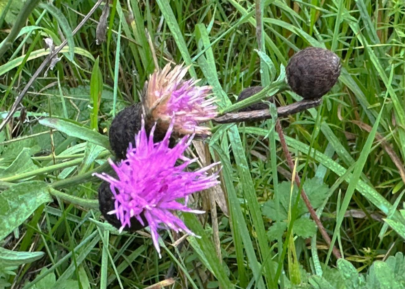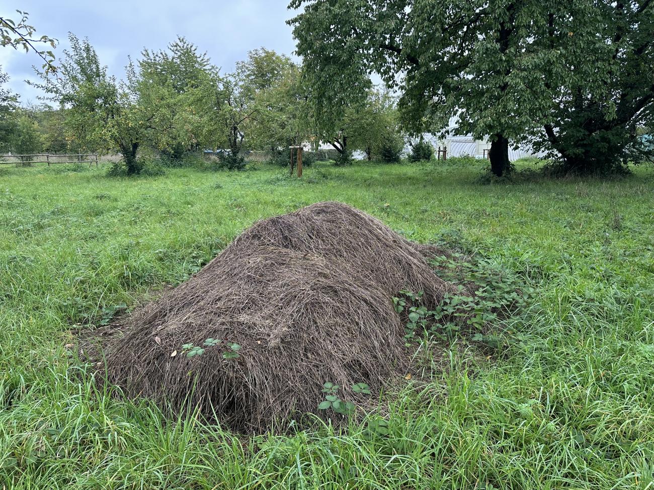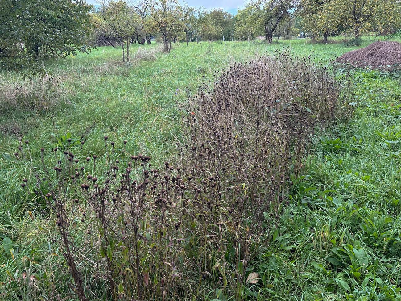 Es hat geregnet, alles ist noch nass. Beim Mähen wurden die 3-4 Quadratmeter abgeblühte Wiesen-Flockenblumen stehen gelassen, damit sich an den Stengeln die neue Generation Insekten, vor allem die Schmetterlinge entwickeln können. 3 Fliegen und eine rote Wanze gesichtet. Insgesamt ur noch wenige Insekten heute Ende September gesichtet.