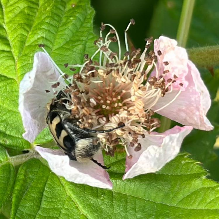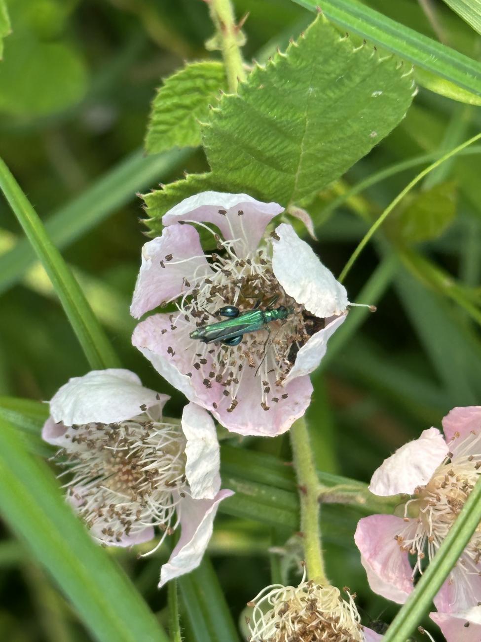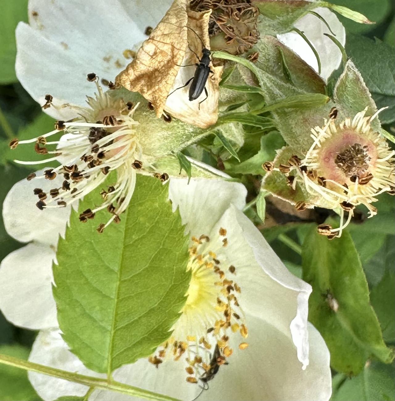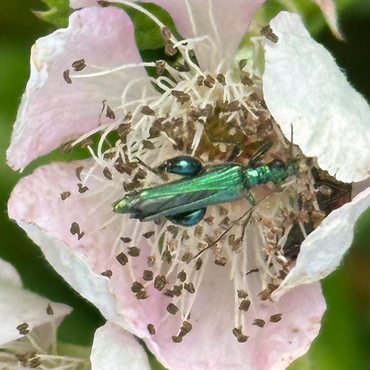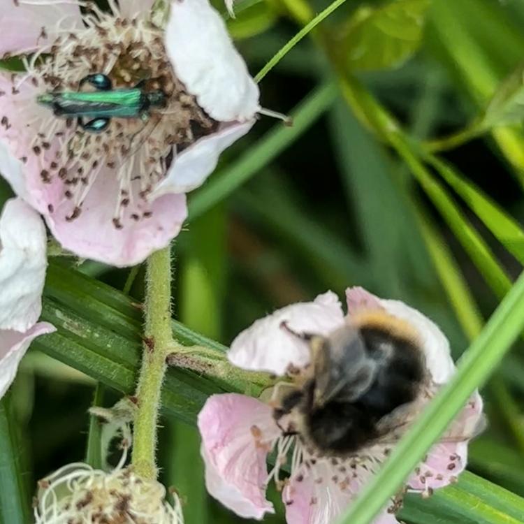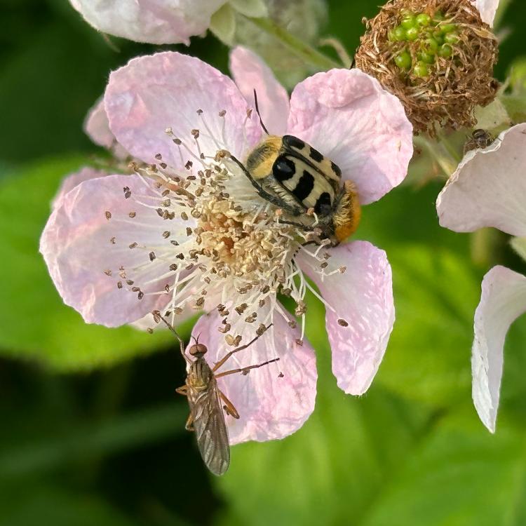 Heute war ein ganz besonderer Tag hier an der Fläche: An der großen Brombeerhecke habe ich sage und schreibe 3 Exemplare des Geschienten Pinselkäfers gesichtet (manchmal auch Gebänderter Pinselkäfer genannt). Diese Käferart ist wunderbar und nur selten zu sehen - und dann gleich 3 davon! Ich habe sie nur an diesem einen Tag gesehen, dann nicht mehr. Außerdem jede Menge Insekten an den Brombeerblüten: Hummeln, Käfer aller Art, eine schöne Schnake, wunderbar war auch die Tanzfliege, die ich zusammen mit einem Pinselkäfer fotografieren konnte. Ein Ameisensackkäfer, eine Schwebfliege der Art Eupeodes. Diese Brombeerblüten sind heute ein Fest für die Insekten, die sich hier heute wohl alle treffen. Ein Falke flog über die R7-Spitzäcker.