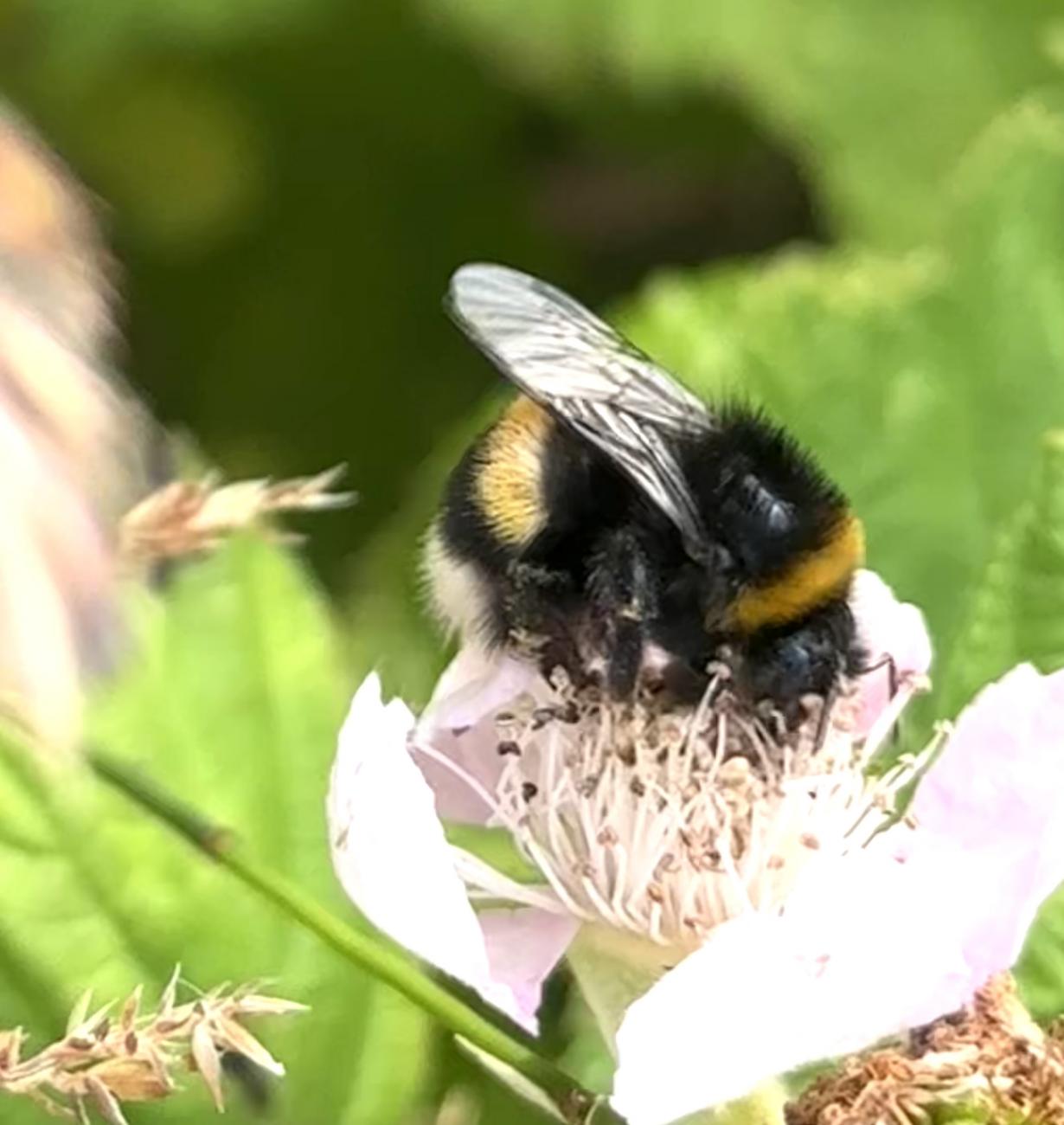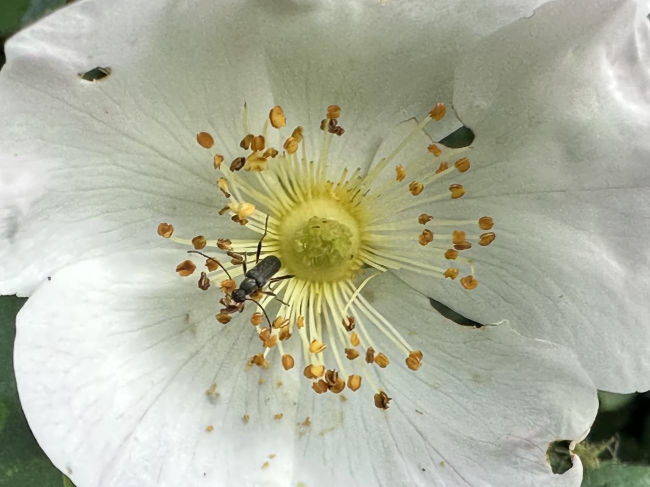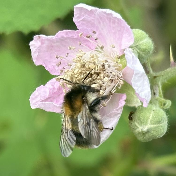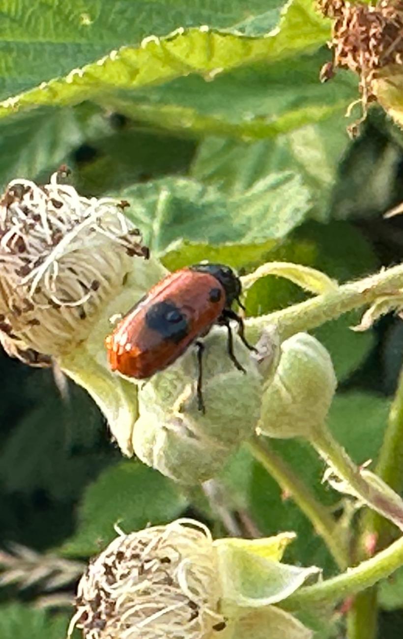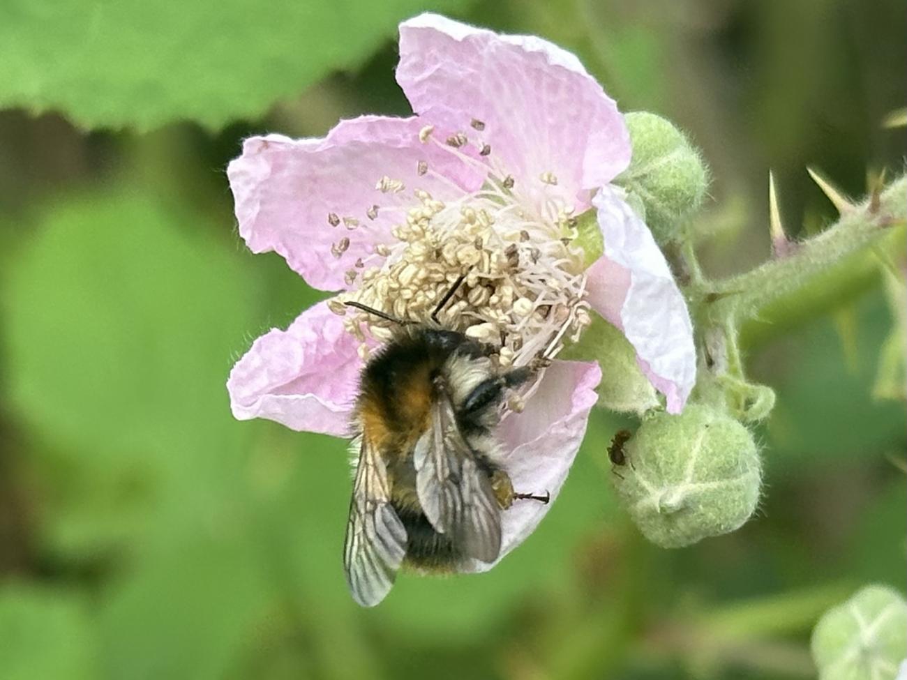Heute war ein ganz besonderer Tag hier an der Fläche: An der großen Brombeerhecke habe ich sage und schreibe 3 Exemplare des Geschienten Pinselkäfers gesichtet (manchmal auch Gebänderter Pinselkäfer genannt). Diese Käferart ist wunderbar und nur selten zu sehen - und dann gleich 3 davon! Ich habe sie nur an diesem einen Tag gesehen, dann nicht mehr. Außerdem jede Menge Insekten an den Brombeerblüten: Hummeln, Käfer aller Art, eine schöne Schnake, wunderbar war auch die Tanzfliege, die ich zusammen mit einem Pinselkäfer fotografieren konnte. Ein Ameisensackkäfer, eine Schwebfliege der Art Eupeodes. Diese Brombeerblüten sind heute ein Fest für die Insekten, die sich hier heute wohl alle treffen. Ein Falke flog über die R7-Spitzäcker.