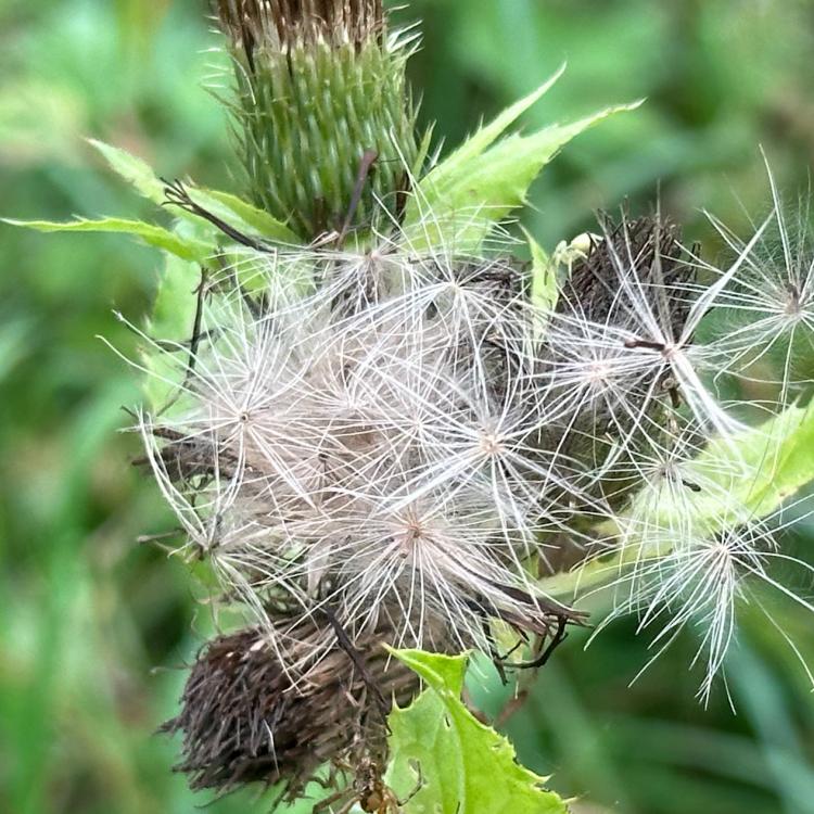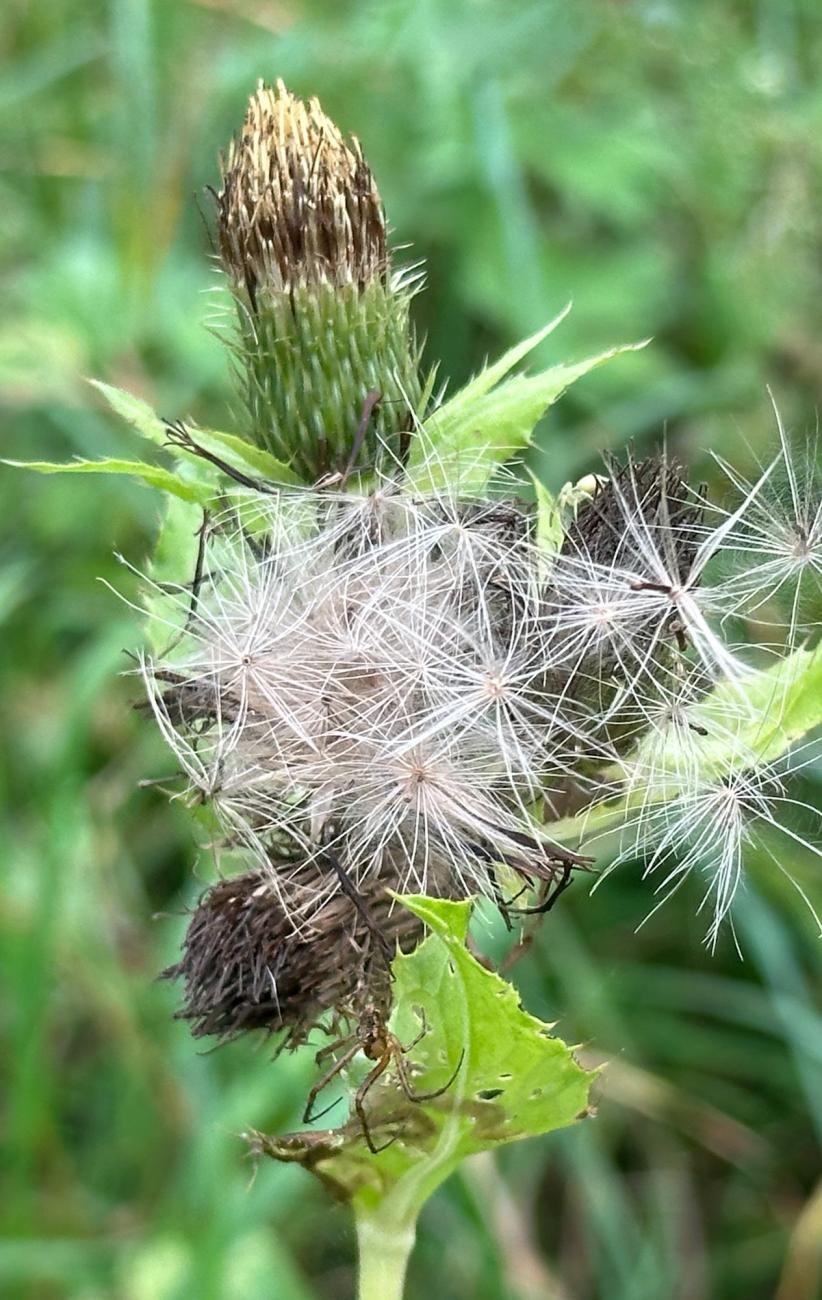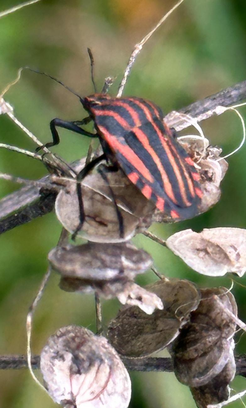 Die Streifenwanzen lieben die Samen des Wiesen-Bärenklaus. Sehr spät im Jahr sind sie sehr oft darauf zu finden. Auf einer Kohl-Kratzdistel mit Samenständen ist unterhalb eine Spinne zu sehen. Jetzt gibt es nicht mehr viele Blüten, dies sind die allerletzten in diesem Jahr.