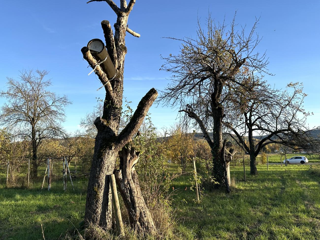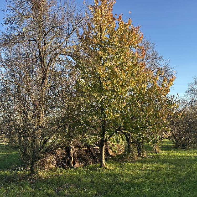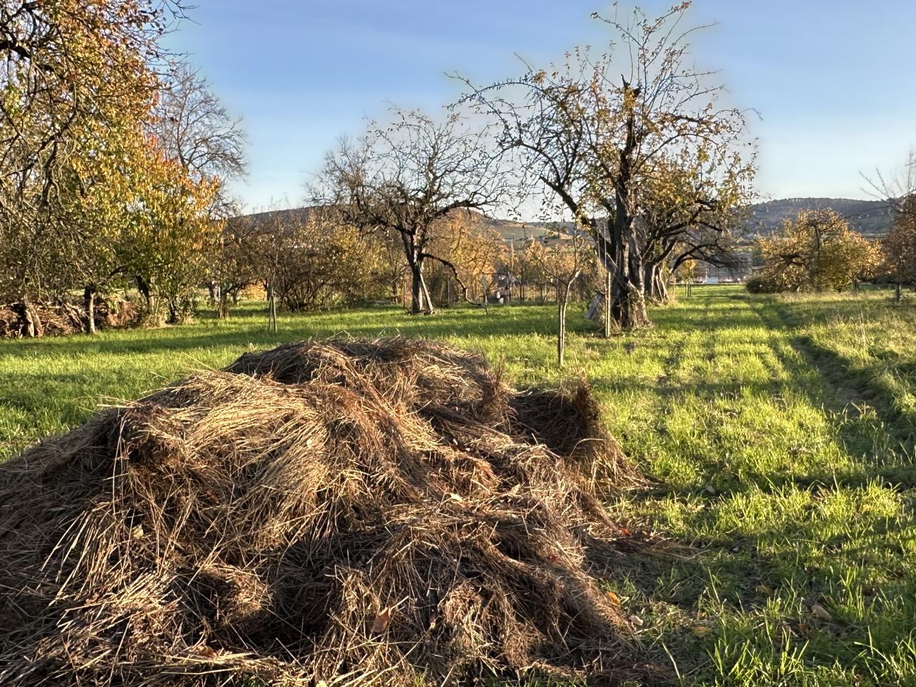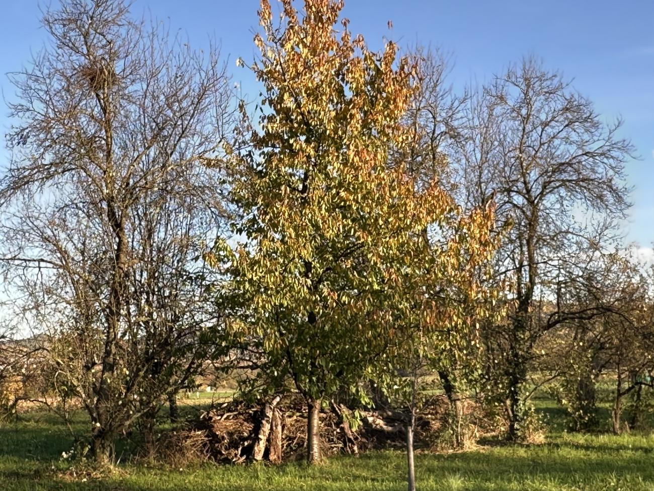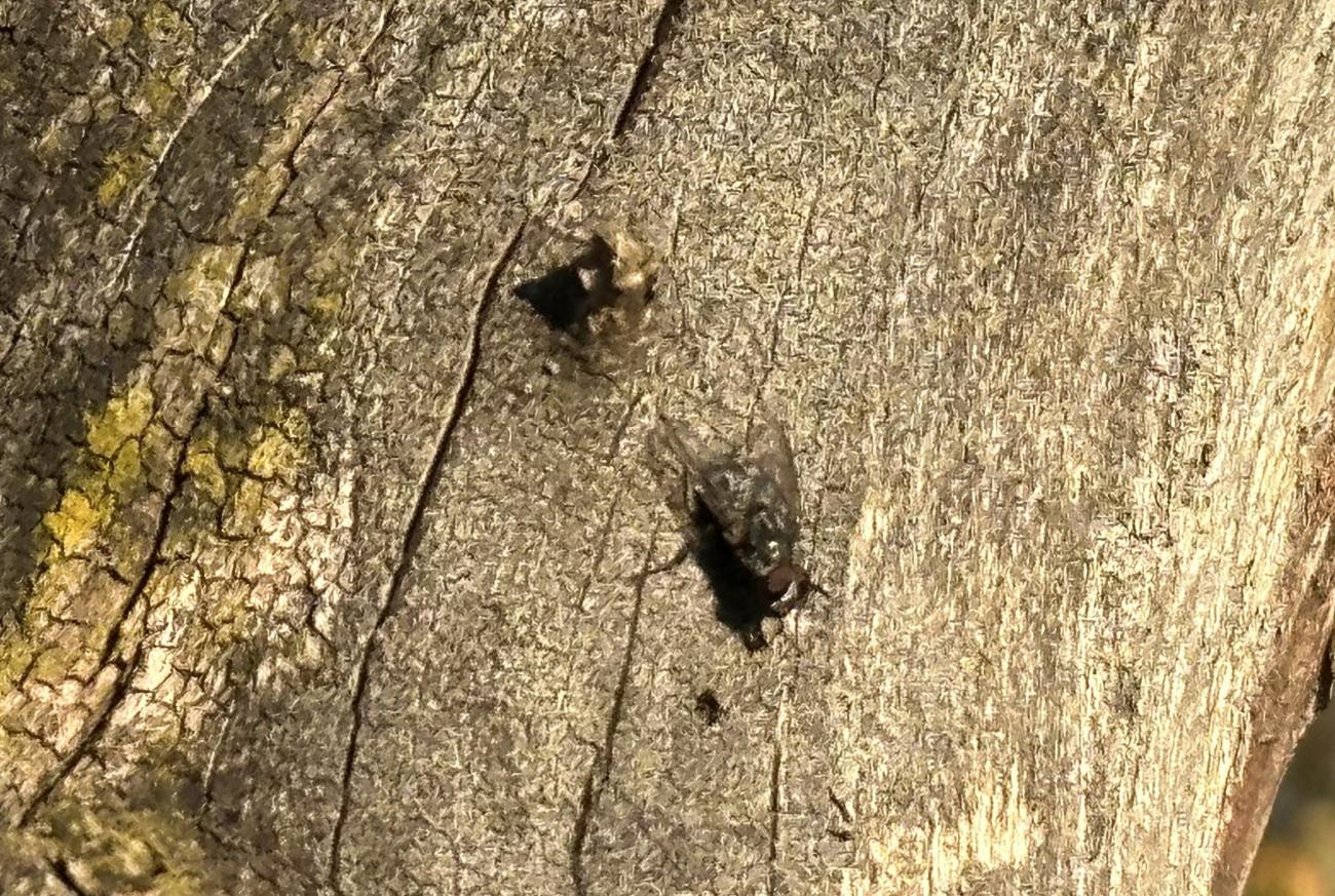 Ein letzte Sichtung Ende Oktober bei strahlendem Sonnenschein. Viele Fliegen sitzen auf warmem Holz und geniessen die Sonne. Zum ersten Mal gesichtet: Eine Schabenart auf einem liegendem Holzstamm, wahrscheinlich eine Bernstein-Waldschabe. Die Blätter der Bäume sind wunderbar herbstlich bunt. An den Hundsrosen sind viele rötliche Pflanzengallen der Gallwespe..